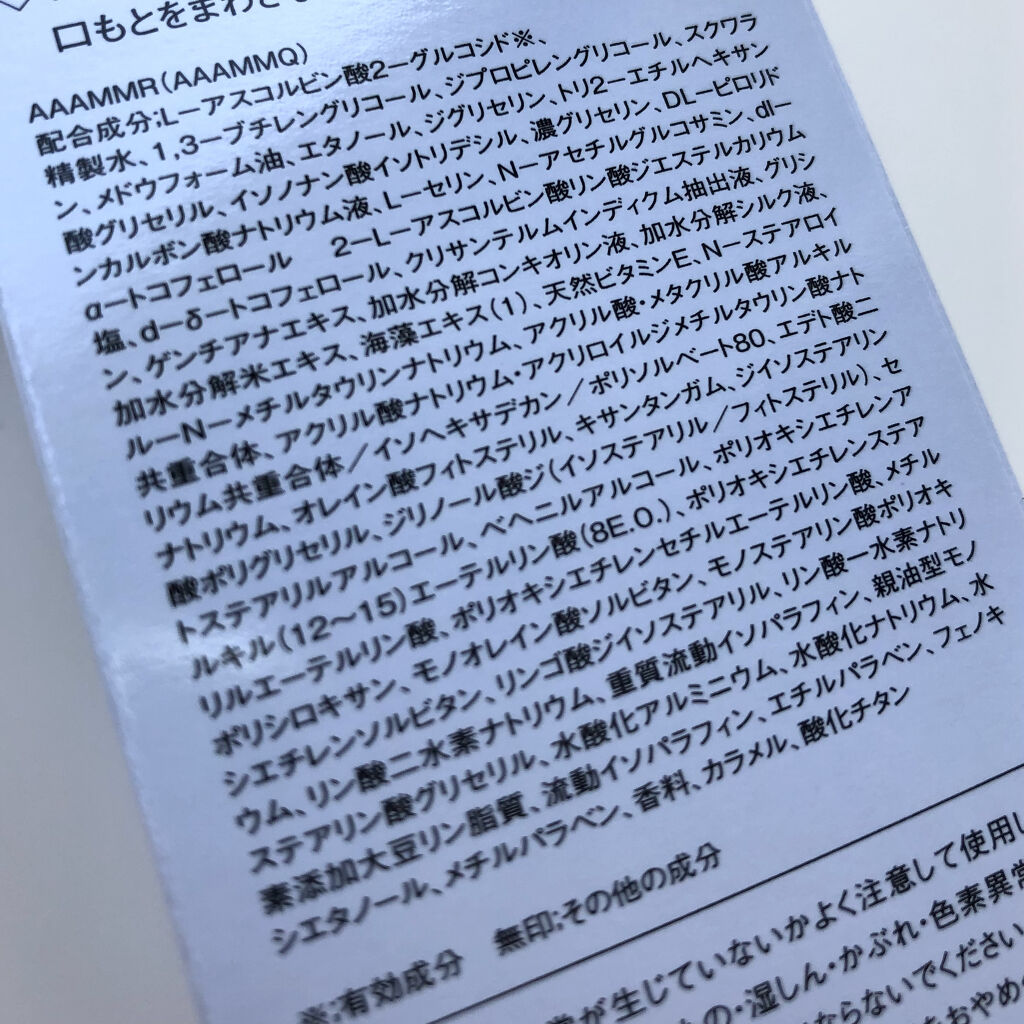 - <I> 有効成分 L-アスコルビン酸 2-グルコシド その他の成分 精製水、1,3-ブチレングリコール、メチルポリシロキサン、エタノー ル、2-エチルヘキサン酸セチル、ジグリセリン、オレイン酸オレイル、DL ピロリドンカルボン酸ナトリウム液、L-セリン、N-アセチルグルコサ ミン、dl-a-トコフェロール 2-L-アスコルビン酸リン酸ジエステルカリ ウム塩、d-3-トコフェロール、アルテアエキス、オリブ油、クリサンテ ルムインディクム抽出液、グリシン、ゲンチアナエキス、シラカバエキス、ホホバ油、加水分解コンキオリン液、加水分解シルク液、N-ステアロイル L-グルタミン酸ナトリウム、N-ステアロイル-N-メチルタウリンナ トリウム、l-メントール、アクリル酸 メタクリル酸アルキル共重合体、アクリル酸ナトリウム アクリロイルジメチルタウリン酸ナトリウム共重合 体/イソヘキサデカン/ポリソルベート80、エデト酸二ナトリウム、キサ ンタンガム、ジイソステアリン酸ダイマージリノレイル、ジペンタエリトリ ット脂肪酸エステル (1) ジリノール酸ジイソステアリル/フィトステ リル)、セトステアリルアルコール、ナイロン末、ベヘニルアルコール、ポ リオキシエチレンアルキル (12~15) エーテルリン酸 (8E.O.)、ポリ オキシエチレンステアリルエーテルリン酸、ポリオキシエチレンセチルエー テルリン酸、モノオレイン酸ソルビタン、モノステアリン酸ポリオキシエチ レンソルビタン、リンゴ酸ジイソステアリル、リン酸一水素ナトリウム、リ ン酸二水素ナトリウム、親油型モノステアリン酸グリセリル、水酸化アルミ ニウム、水酸化ナトリウム、水素添加大豆リン脂質、濃グリセリン、フェノ キシエタノール、メチルパラベン、香料、カラメル、酸化チタン <II> 有効成分 L-アスコルビン酸 2-グルコシド その他の成分 精製水、ジプロピレングリコール、1,3-ブチレングリコール、スクワラ ン、メドウフォーム油、エタノール、イソノナン酸イソトリデシル、トリ2 エチルヘキサン酸グリセリル、DL-ピロリドンカルボン酸ナトリウム 液、L-セリン、N-アセチルグルコサミン、dl-a-トコフェロール 2-L -アスコルビン酸リン酸ジエステルカリウム塩、d-3-トコフェロール、アセチル化ヒアルロン酸ナトリウム、クリサンテルムインディクム抽出液、グリシン、ゲンチアナエキス、加水分解コンキオリン液、加水分解シルク 液、天然ビタミンE、N-ステアロイル-L-グルタミン酸ナトリウム、N- ステアロイル-N-メチルタウリンナトリウム、N-ラウロイル-L-グル タミン酸ジ(フィトステリル 2-オクチルドデシル)、アクリル酸 メタ クリル酸アルキル共重合体、アクリル酸ナトリウム・アクリロイルジメチル タウリン酸ナトリウム共重合体/イソヘキサデカン/ポリソルベート80、イソステアリン酸フィトステリル、エデト酸二ナトリウム、キサンタンガ ム、ジリノール酸ジ (イソステアリル/フィトステリル)、セトステアリル アルコール、ベヘニルアルコール、ポリオキシエチレンアルキル(12~ 15) エーテルリン酸 (8E.O.)、ポリオキシエチレンステアリルエーテ ルリン酸、ポリオキシエチレンセチルエーテルリン酸、メチルポリシロキサ ン、モノオレイン酸ソルビタン、モノステアリン酸ポリオキシエチレンソル ビタン、リンゴ酸ジイソステアリル、リン酸一水素ナトリウム、リン酸二水 素ナトリウム、重質流動イソパラフィン、親油型モノステアリン酸グリセリ ル、水酸化アルミニウム、水酸化ナトリウム、水素添加大豆リン脂質、濃グ リセリン、フェノキシエタノール、メチルパラベン、香料、カラメル、酸化 チタン <III> 有効成分 L-アスコルビン酸 2-グルコシド その他の成分 精製水、1,3-ブチレングリコール、ジプロピレングリコール、スクワラ ン、メドウフォーム油、エタノール、ジグリセリン、トリ2-エチルヘキサ ン酸グリセリル、イソノナン酸イソトリデシル、濃グリセリン、DL-ピロ リドンカルボン酸ナトリウム液、L-セリン、N-アセチルグルコサミン、dl-a-トコフェロール 2-L-アスコルビン酸リン酸ジエステルカリウム 塩、d-a-トコフェロール、クリサンテルムインディクム抽出液、グリシ ン、ゲンチアナエキス、加水分解コンキオリン液、加水分解シルク液、加水 分解米エキス、海藻エキス (1) 天然ビタミンE、N-ステアロイル-N- メチルタウリンナトリウム、アクリル酸 メタクリル酸アルキル共重合体、アクリル酸ナトリウム アクリロイルジメチルタウリン酸ナトリウム共重合 体/イソヘキサデカン/ポリソルベート80、エデト酸二ナトリウム、オレ イン酸フィトステリル、キサンタンガム、ジイソステアリン酸ポリグリセリ ル、ジリノール酸ジ (イソステアリル/フィトステリル)、セトステアリル アルコール、ベヘニルアルコール、ポリオキシエチレンアルキル(12~ 15) エーテルリン酸 (8E.O.)、ポリオキシエチレンステアリルエーテ ルリン酸、ポリオキシエチレンセチルエーテルリン酸、メチルポリシロキサ ン、モノオレイン酸ソルビタン、モノス