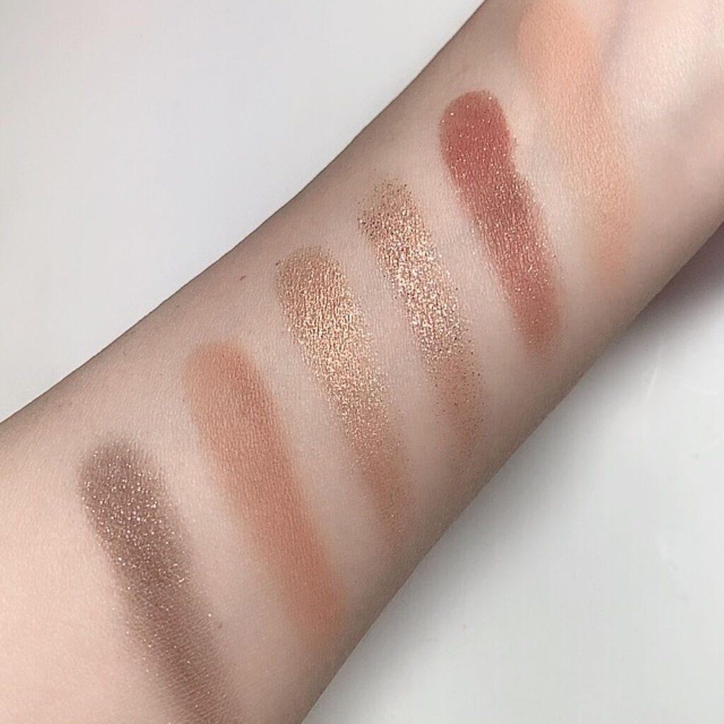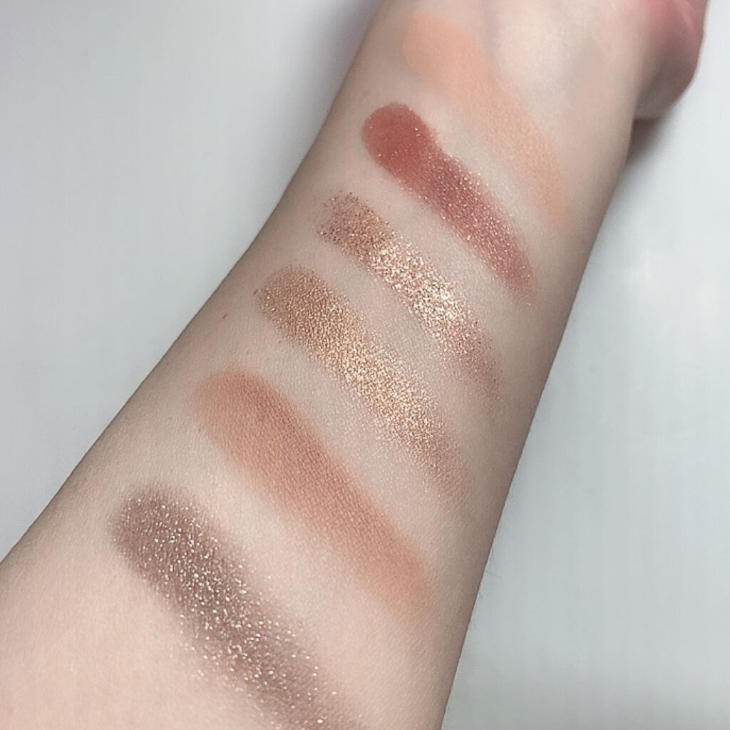 \はろはろー/今回は何個か前に投稿した#VTプログロスの#福袋に入っていた#アイシャドウパレットの#スウォッチを載せていきます☺️✨6色入りでマット〜大粒ラメまで楽しめるパレットになっていますよー♫ピンクベージュやピンクブラウン、締め色はダー...