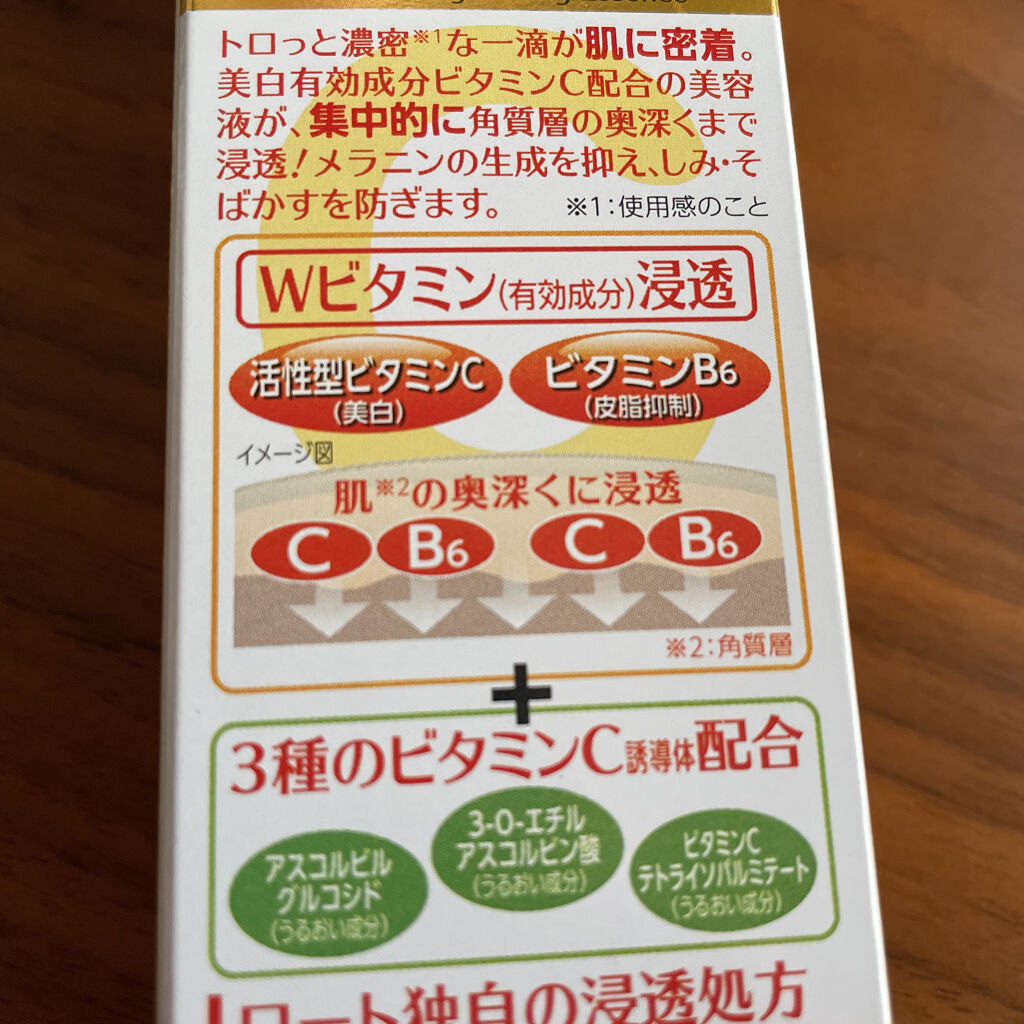 - 【医薬部外品】 これ以上シミ*1を増やしたくない人にオススメしたい薬用美白美容液。 トロッと濃密なテクスチャーの一滴が肌に密着。美白有効成分 活性型ビタミンC*2に加え、うるおい成分として3種のビタミンC誘導体*3も配合しました。ロート製薬独自の浸透処方で、集中的に角層すみずみまで浸透。気になるシミの元まで届き、メラニンの生成を抑え、しみ・そばかすを防ぎます。また、有効成分として皮脂抑制成分:ピリドキシン塩酸塩、殺菌成分:イソプロピルメチルフェノール、抗炎症成分:アラントインも配合し、気になるニキビもしっかり予防します。 洗顔後に化粧水等でお肌を整えた後、適量を手のひらにとり、気になる部分または顔全体になじませて使用します。 *1:日焼けによる *2:アスコルビン酸 *3:L-アスコルビン酸2-グルコシド(アスコルビルグルコシド)、3-O-エチルアスコルビン酸、ビタミンCテトライソパルミテート