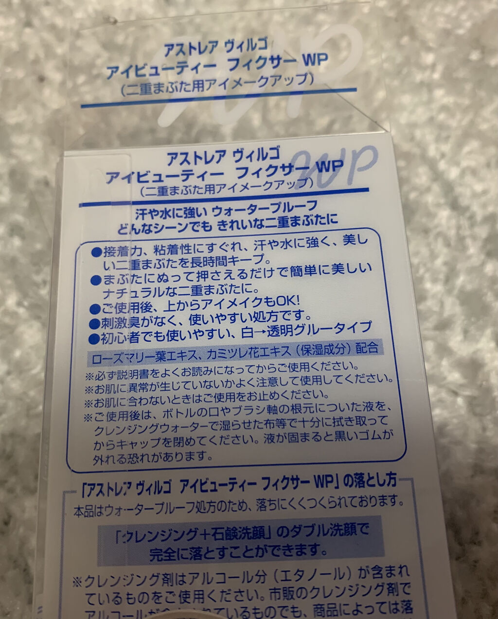 - ダブル洗顔(クレンジング+泡洗顔)をしないと落とせないほどしっかりと接着します。 水に濡れても白くならず、美しい二重まぶたを長時間キープできます。刺激臭もなく、使いやすい処方です。 ローズマリー葉エキス(保湿成分)、カミツレ花エキス(保湿成分)配合。