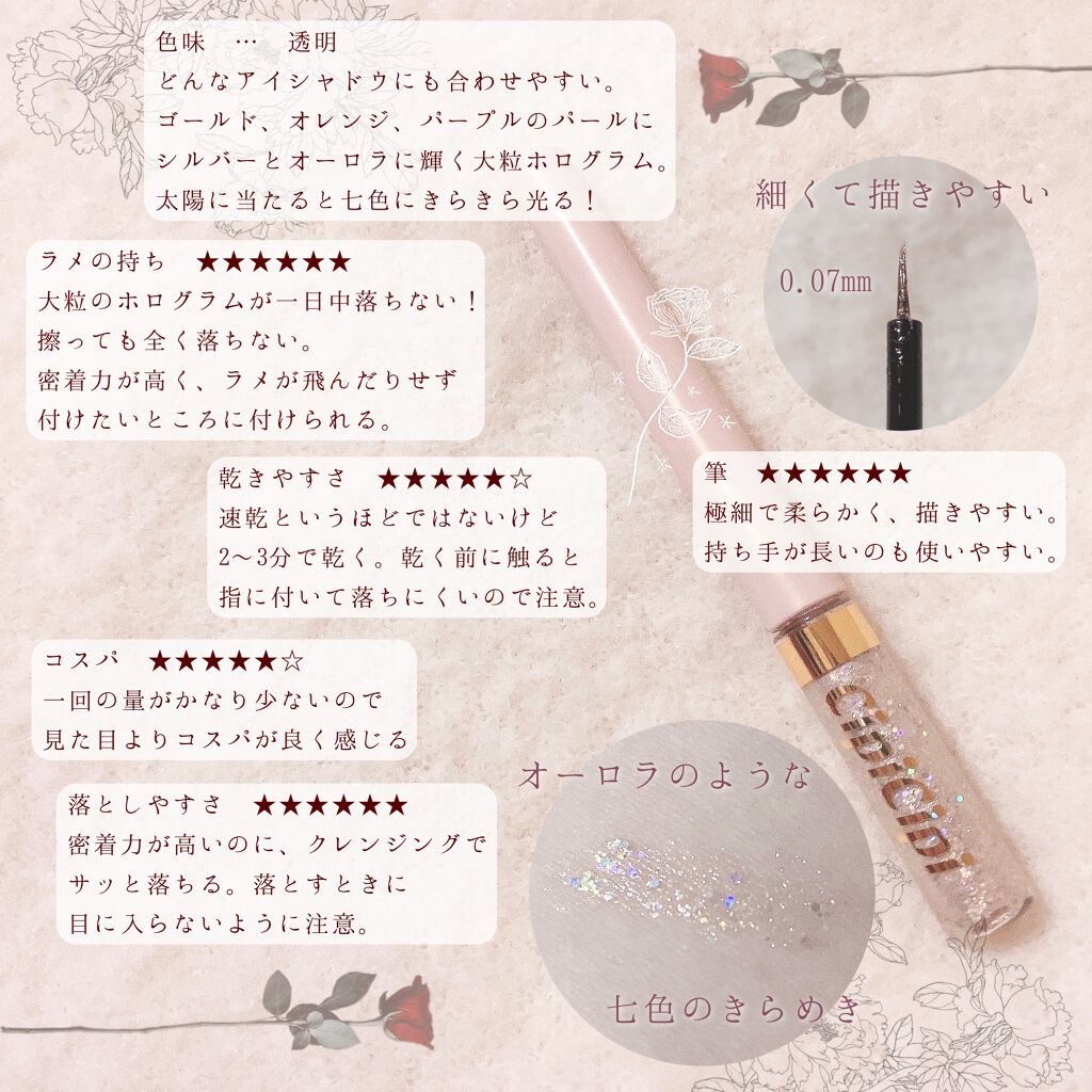 - ・目元に光を集めるグリッターラメをたっぷり配合 ・こだわりの高密着ベース 植物性の皮膜剤(※)を配合、お肌に優しくぴったり密着します。 (※)シロキクラゲ多糖体、チューべロース多糖体 ・描きやすさバツグン極細筆 しなやかな0.07mmの極細毛を採用。のせたい場所にピンポイントにラメをのせることができます。 ・目元をケアする9種類の保湿成分配合 スクワラン、加水分解エラスチン、ヒアルロン酸、チューベロース多糖体、加水分解コラーゲン、シロキクラゲ多糖体、セラミドNP、セラミドAP、セラミドEOP 保湿感がありつつ、乾いた後に柔らかい膜感がつっぱることなく、ラメの定着性を上げています。