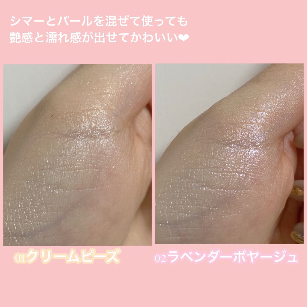 肌が発光してみえるから本当に買ってよかった 右のラメ強めなベビーピンクと左のパール強めなシェルピンクが使いやすくて可愛すぎる… 艶感が本当にナチュラルなのに綺麗でデイリー使いに向きすぎ。