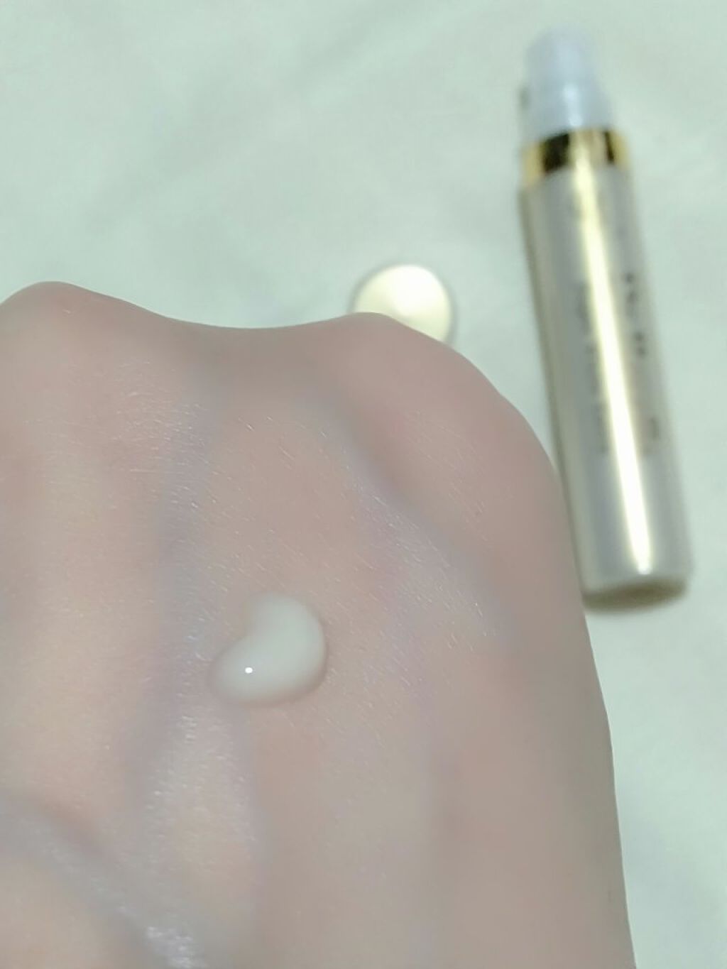 目もとをロールオンでなぞるように転がし、塗布。 ひんやりとロールが転がり、とぅるんと美容液が広がっていく。 こちらは回して適量を繰り出して使用。 スティック状になったバームは細くカッティングされてて、目元へ塗りやすい。 バームは白く固形となってて、肌に触れるとすっーととろけてなじむ使用感。 油分によるべたべた重い感じがなく、使いやすい。