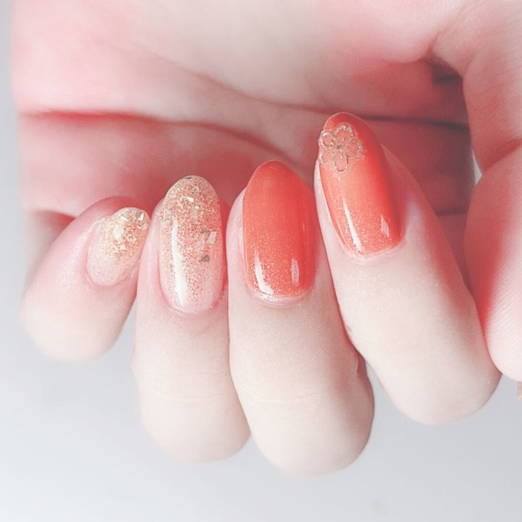 オレンジの誘惑に負けた🧡😍可愛すぎる!!ちふれのオレンジラメ🧡ちふれネイルエナメル017カラフルラメ可愛い、、マジで可愛すぎて夢中で塗ってたら、グラデーションしか出来なかった(笑)オレンジの微細なラメに、大きめゴールドのホロ⭐️塗るとシアーな...