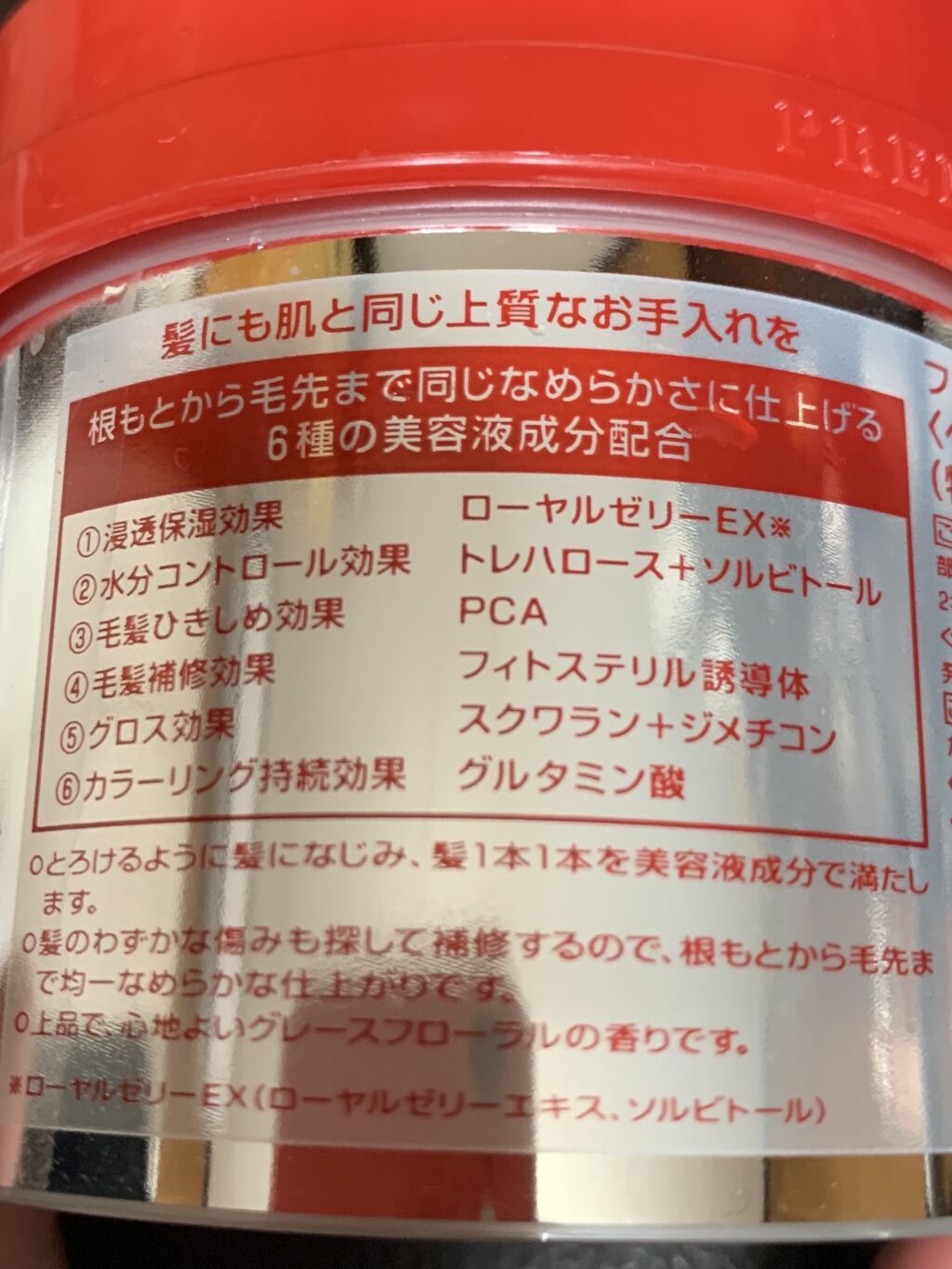 - <本体230g> 水、ソルビトール、ジメチコン、水添ナタネ油アルコール、イソペンチルジオール、ベヘントリモニウムクロリド、アミノプロピルジメチコン、アルキル(C12、14)オキシヒドロキシプロピルアルギニンHCl、ステアリルジヒドロキシプロピルジモニウムオリゴ糖、グルタミン酸、トレハロース、スクワラン、ステアルトリモニウムクロリド、PEG-90M、PCA、ラウロイルグルタミン酸ジ(フィトステリル/オクチルドデシル)、加水分解コムギタンパク、ポリクオタニウム-64、加水分解コムギデンプン、ローヤルゼリーエキス、イソプロパノール、セタノール、オクチルドデカノール、エタノール、PG、BG、トコフェロール、フェノキシエタノール、安息香酸Na、香料、黄5 <つめかえ用700g> 水、ソルビトール、ジメチコン、水添ナタネ油アルコール、イソペンチルジオール、ベヘントリモニウムクロリド、アミノプロピルジメチコン、アルキル(C12、14)オキシヒドロキシプロピルアルギニンHCl、ステアリルジヒドロキシプロピルジモニウムオリゴ糖、グルタミン酸、トレハロース、スクワラン、ステアルトリモニウムクロリド、PEG-90M、PCA、ラウロイルグルタミン酸ジ(フィトステリル/オクチルドデシル)、加水分解コムギタンパク、ポリクオタニウム-64、加水分解コムギデンプン、ローヤルゼリーエキス、イソプロパノール、セタノール、オクチルドデカノール、エタノール、PG、BG、トコフェロール、フェノキシエタノール、安息香酸Na、香料、黄5 <ピンクリボン(230g)> シリカ、水、BG、ジメチコン、ソルビトール、フェノキシエタノール、スクワラン、香料、トコフェロール、エタノール、ローヤルゼリーエキス、セタノール、トレハロース、イソペンチルジオール、イソプロパノール、ベヘントリモニウムクロリド、ポリクオタニウム-64、PCA、PEG-90M、黄5、BHT、ラウロイルグルタミン酸ジ(フィトステリル/オクチルドデシル)、水添ナタネ油アルコール、グルタミン酸、オクチルドデカノール、安息香酸Na、ステアルトリモニウムクロリド、アミノプロピルジメチコン、アルキル(C12、14)オキシヒドロキシプロピルアルギニンHCI