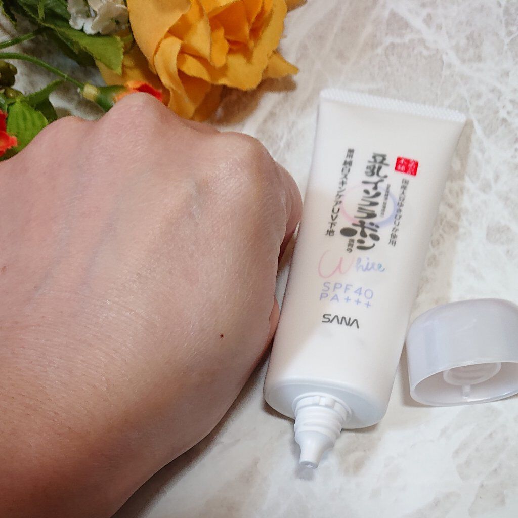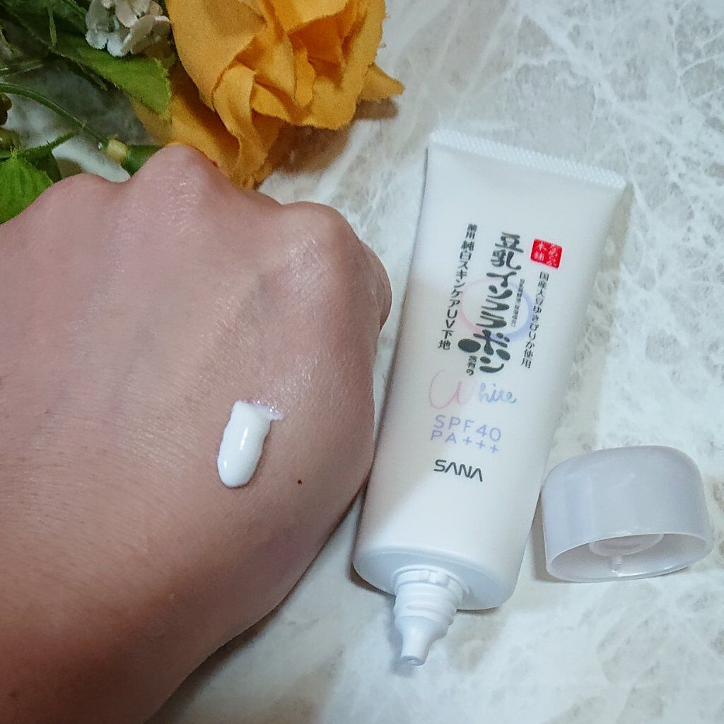 - <薬用美白スキンケアUV下地> 豆乳の美白スキンケアUV下地。肌荒れ&ニキビ予防しながら美白!メラニンの生成を抑え、シミ・そばかすを防ぎます。トーンアップ(メイク効果による)&皮脂崩れ防止。化粧水・美容液・乳液・クリーム・UVカット・化粧下地の1本6役。SPF40・PA+++。[販売名:サナ なめらか本舗 薬用美白スキンケアUV下地]