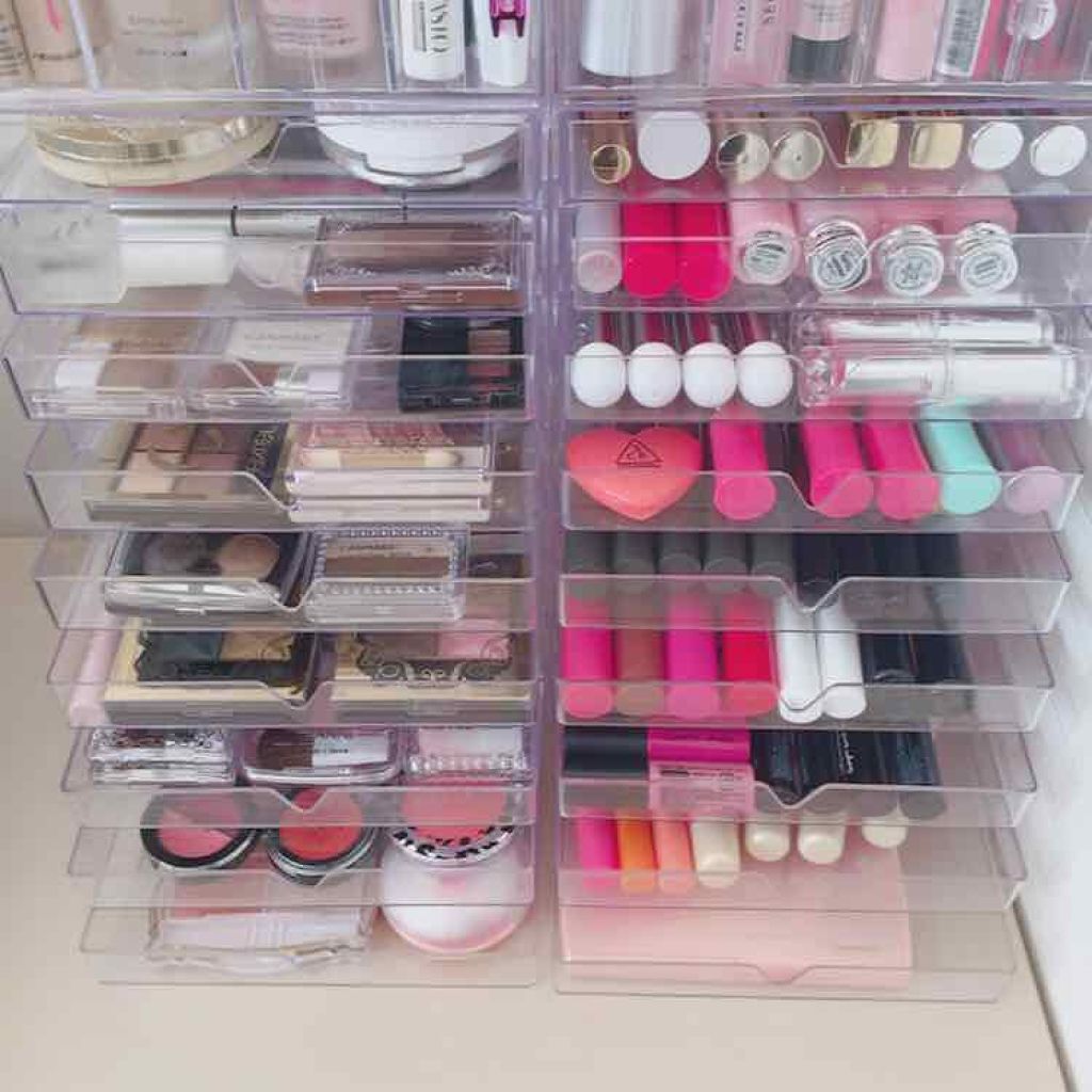 コスメ収納紹介3段クリアケース以外も多分ダイソーだけどもう売っていないかもおでかけ用お泊り用ポーチとその他パック以外はほぼ全て大集合低めの机だから置いてあるだけでメイクは別の場所へ推し活とコスメが両立出来るようコスメの数を減らしてグッズを置け...