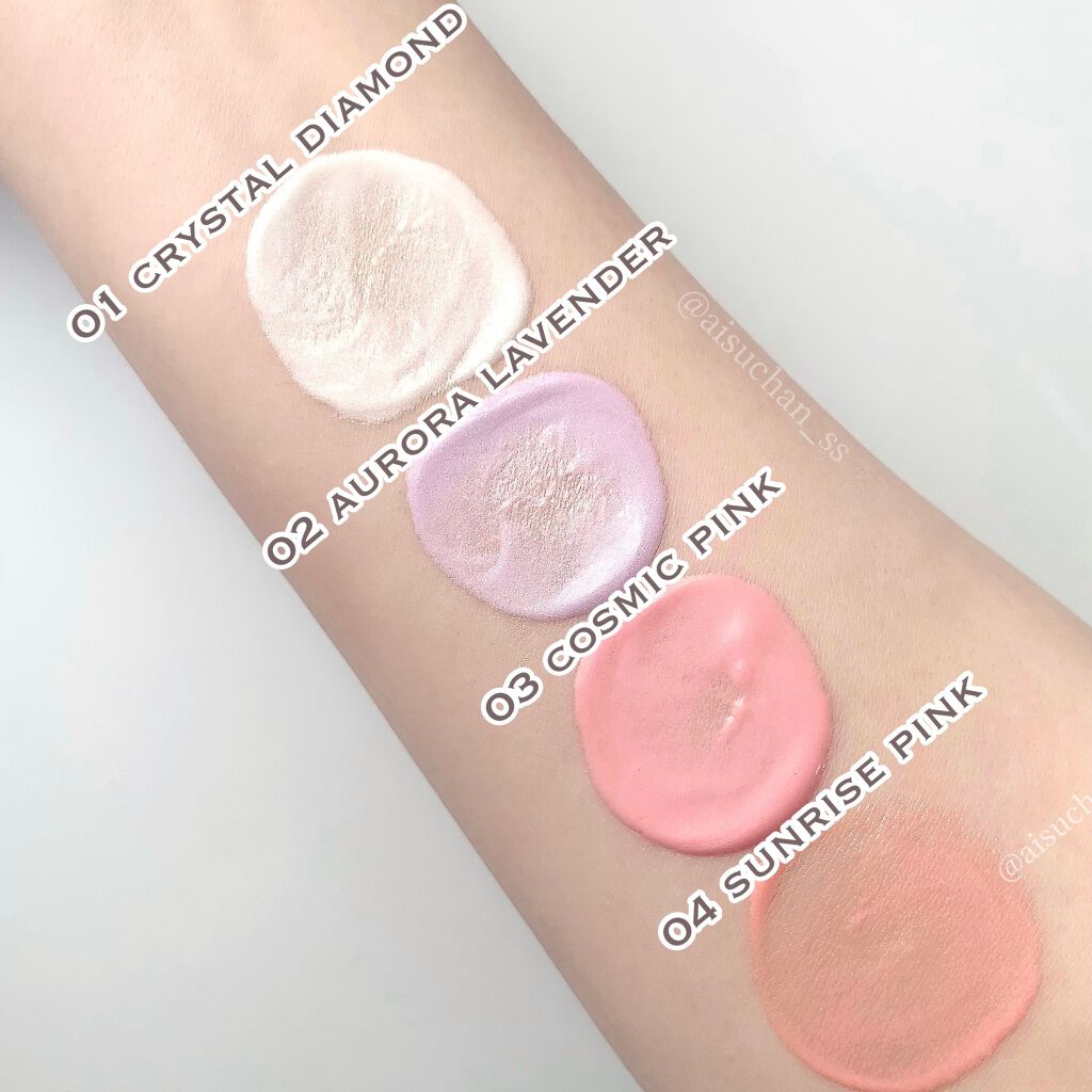 しっとりなめらかな粉質で、肌に光が溶け込む。 ツヤの美しさや発光具合は写真の通り。 ひと塗りで極上の艶を纏うことができます。 私が1番感動したのは 03 パールグロウ 水色やパープルをはじめとした細かいラメがぎっしり。 まるでダイヤモンドのような輝きでこれが最高💎 いざ肌に乗せると透明感たっぷりで白浮きしません。 今日アイシャドウとして使ってみたらまぶたが濡れたように艶めいて最高だった!! ラメ大好き芸人のみなさんは絶対チェックして欲しいです。 パケもしっかり可愛いです♡ 中身も見た目ももはや無敵。 これ、買わない理由ある??