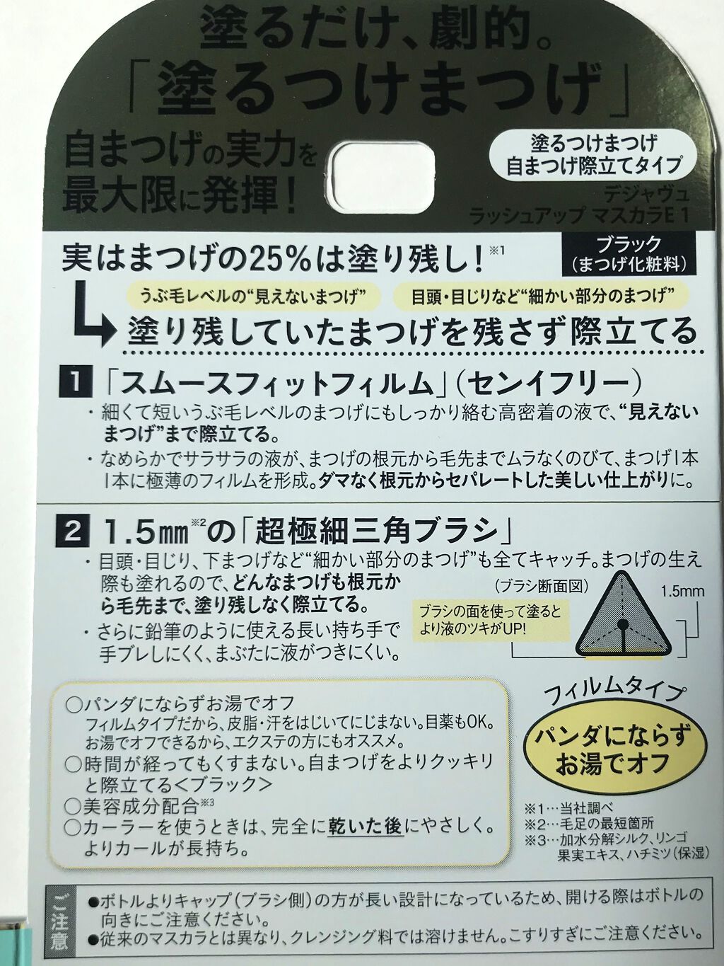 - ロングでもボリュームでもない、「自まつげを際立てる」という新発想 “見えないまつげ”も1本残らず際立てて、目ヂカラを最大限に引き出す 1.うぶ毛レベルの“見えないまつげ”も際立てる「高密着フィルム」 2.あらゆるまつげも1本残らず際立てる「超極細三角ブラシ」