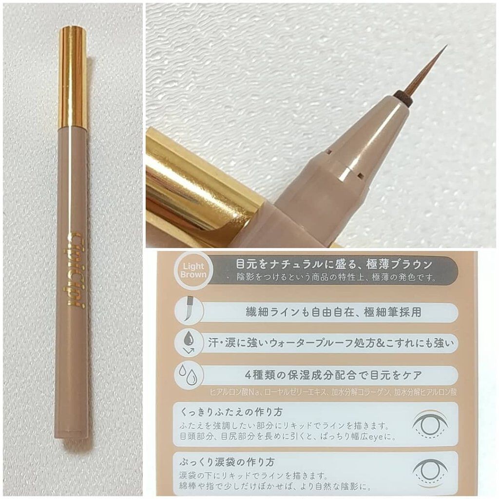 - ※順次パッケージリニューアル。尚これにかかる返品、交換は承っておりません。 <R ライトブラウン> ・使い方は何通りもある万能筆 二重の線に沿って描けばパッチリした目印象に、二重ラインを延長して描けば目の横幅が出ます。 涙袋の影の部分に描けば目の縦幅が出て自然なデカ目に。 唇の両端にちょんとラインを足せばアゲ口角ラインにも。 ・繊細ラインも自由自在、超極細筆 0.1mmの極細毛を採用。 絶妙なブラウンカラーで肌に自然な陰影を ・汗や涙に強いウォータープルーフ処方、擦れにも強い 汗や涙に強いウォータープルーフ&こすれにも強く落ちにくい ・目元をケアする4種類の保湿成分配合ヒアルロン酸Na、加水分解コラーゲン、ローヤルゼリーエキス、加水分解ヒアルロン酸
