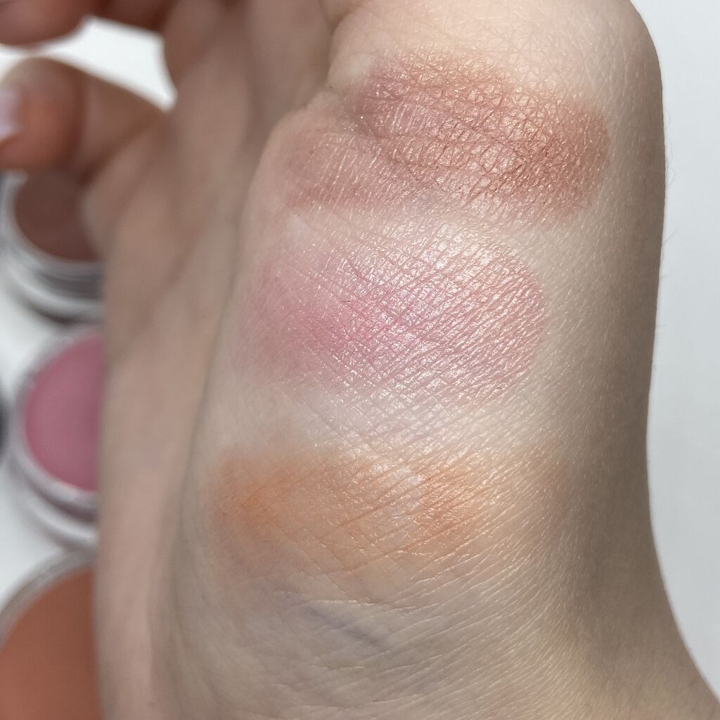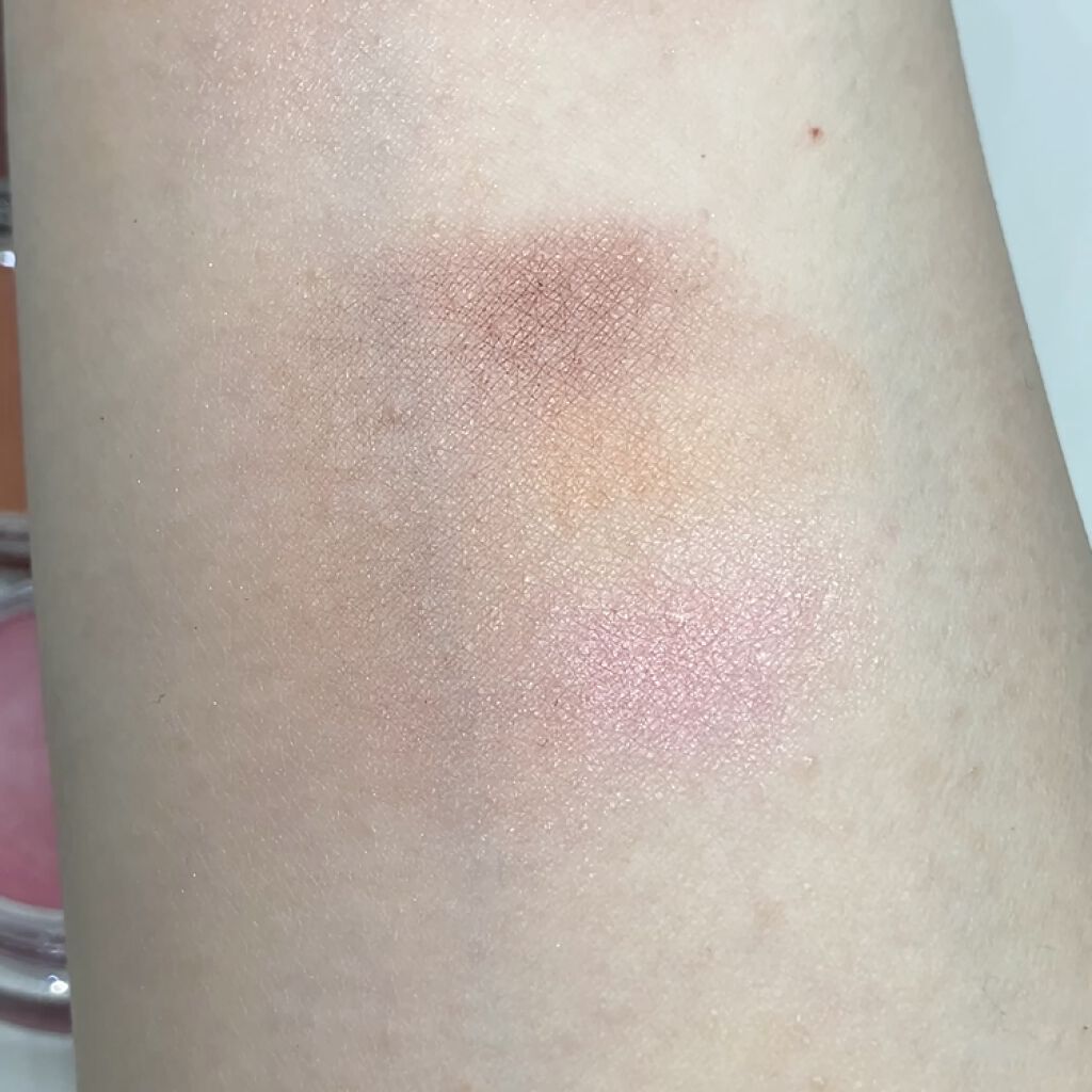 チークポップ持ってる人なら分かると思いますが、パール感は強め。 指で濃いめにつけてるので実際ブラシにとってつけるともっと薄めでモーヴカラー。 白っぽいパールなので見た目より明るめの発色。