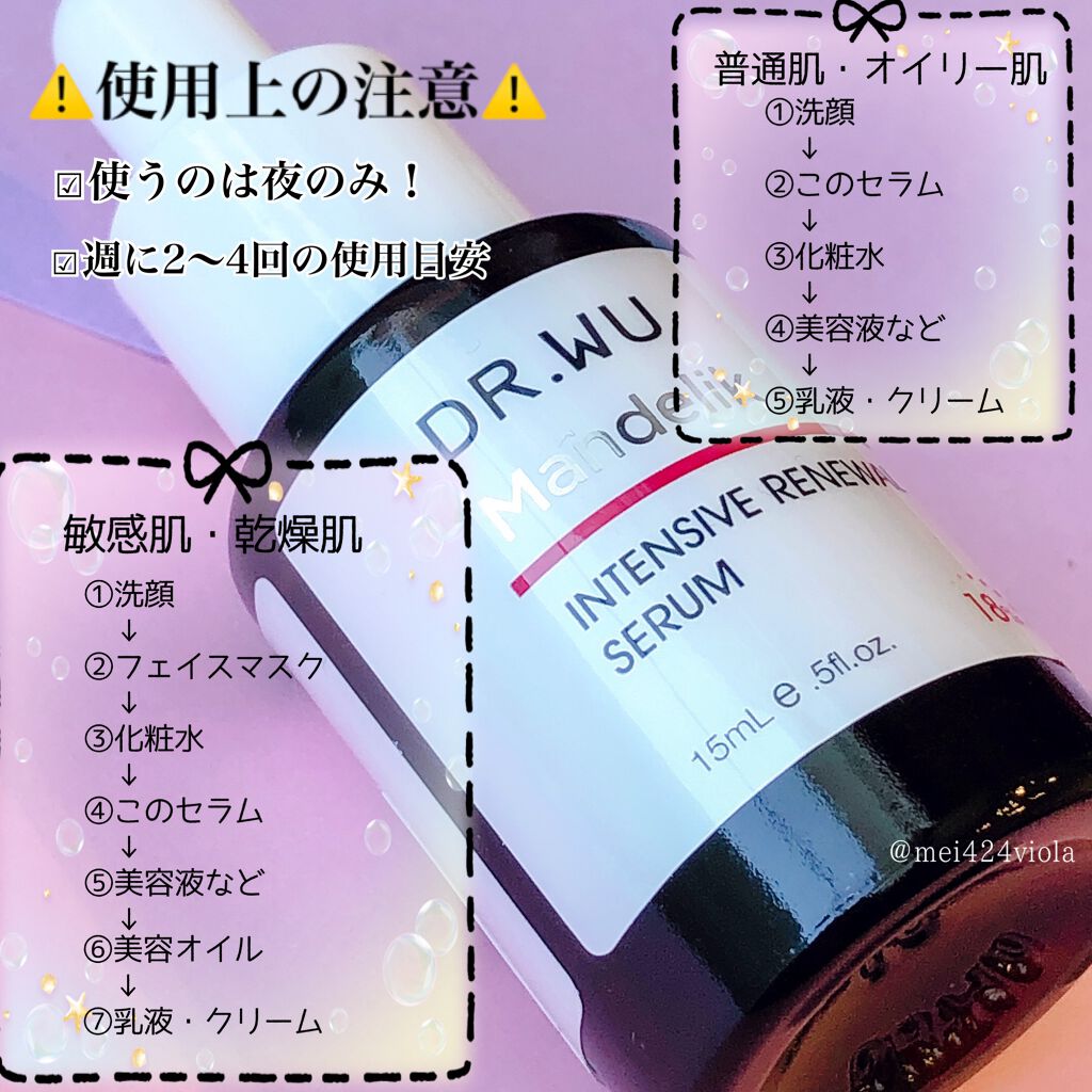 - DR.WU独自の「黄金濃度18%」のマンデル酸(杏仁酸)を配合。 40年以上の臨床経験の粋を集め、Dr.Wu自身がクリニックでも使用するマンデル酸を使用した角質ケア美容液。 汚れや古い角質による毛穴が気になる方へのスペシャルケア。 2022年11月下旬 商品名「マンデリック リニューアル 18% セラム」 から「 マンデリック インテンシブ 18%セラム」へ変更/15mlサイズの商品パッケージの変更