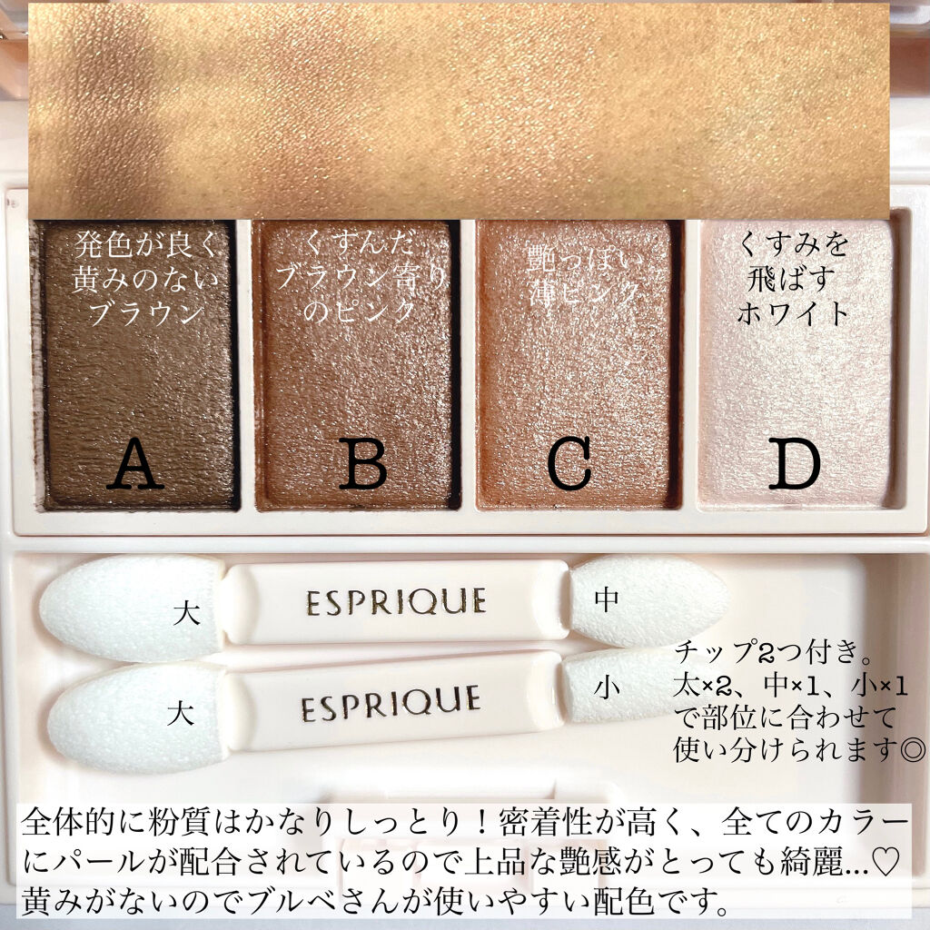 PC別のブラウンカラーで透明感のある柔らかな目もとが叶うというアイカラーパレット。エスプリークメロウフィーリングアイズ結構前からあるようで、使ってみて納得。流行り関係なく使える王道ブラウン。黄ぐすみもカバーしてくれるそう。ナチュラルブ...