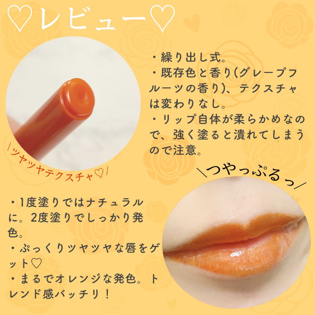 - いつも、“つやぷる”なくちびるで。 1度塗りでシアー、重ねて色気 美容成分(*1)配合で保湿×キレイに発色×ボリュームUP(*2) ティント処方じゃなくても色持ちが持続する処方にリニューアル。 オイル・保湿成分(*1)が唇の上にピタッと密着。 保湿膜をつくることで、ツヤ感・色持ち・唇ケアを同時に叶えます。 従来の“うるおい&発色”はそのままに、ツヤとうるおいをキープする新しい「つやぷるリップ」です。 グレープフルーツの香り。 *1アルガニアスピノサ核油、ホホバ種子油、ヒアルロン酸Na *2メイクアップ効果 ※2023/3/31 リニューアル
