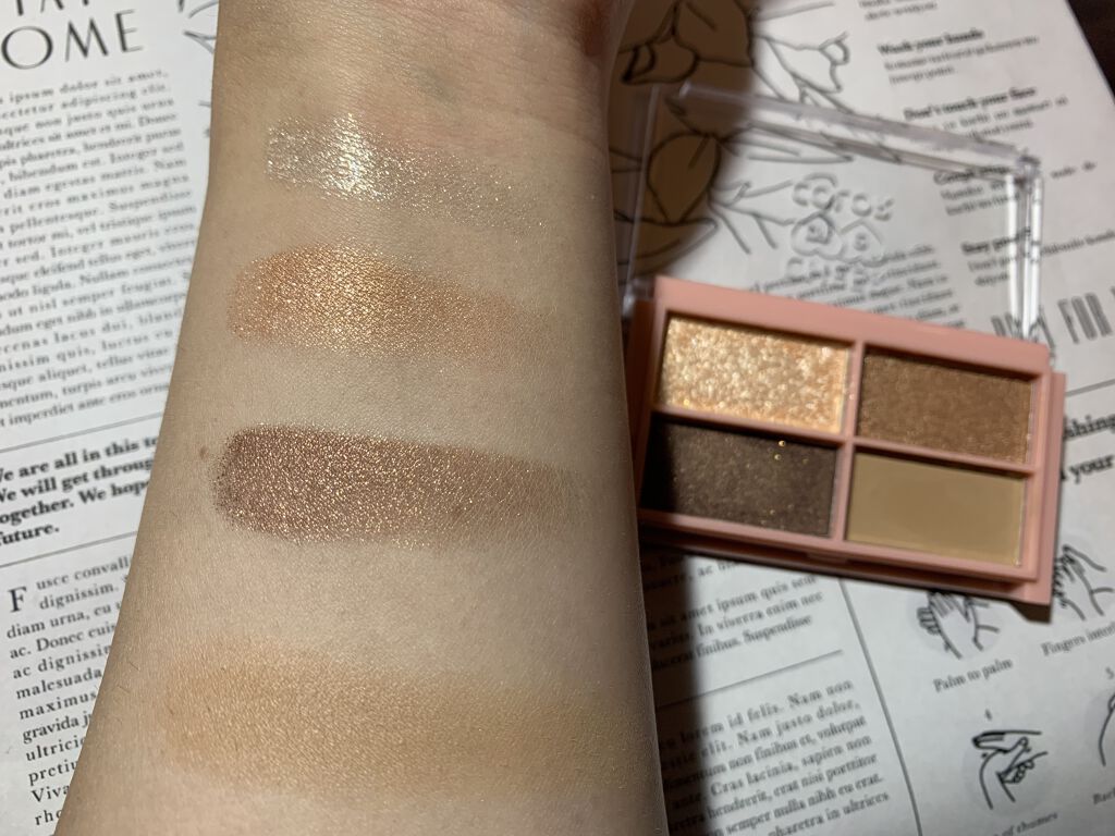 普段、ラメ入りのアイシャドウしか使わないからか、右下のマットの色が私には難しくて😅ベースに使うくらいでしょうか。 右上のラメは本当に使いやすいのですが😂 左上のラメは多きめなので、乗せすぎないように気を付けています。