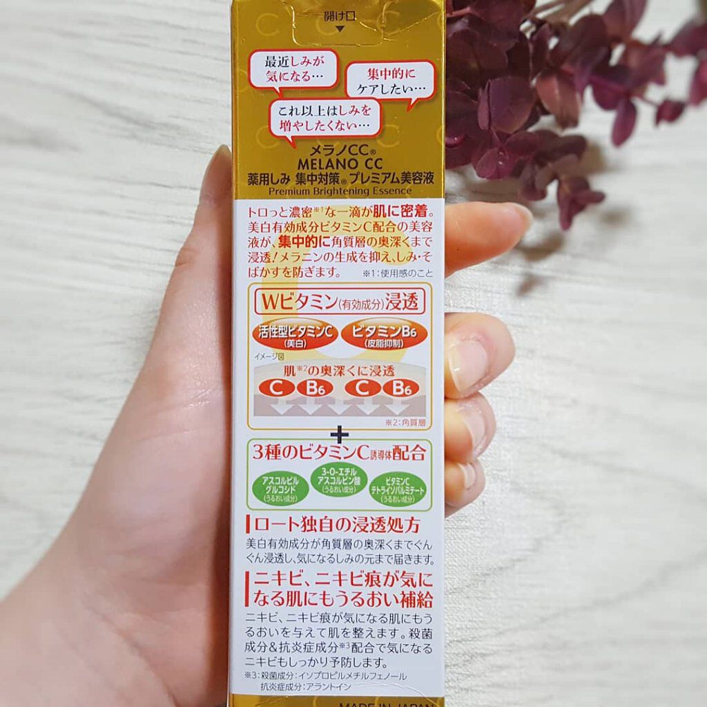- 【医薬部外品】 これ以上シミ*1を増やしたくない人にオススメしたい薬用美白美容液。 トロッと濃密なテクスチャーの一滴が肌に密着。美白有効成分 活性型ビタミンC*2に加え、うるおい成分として3種のビタミンC誘導体*3も配合しました。ロート製薬独自の浸透処方で、集中的に角層すみずみまで浸透。気になるシミの元まで届き、メラニンの生成を抑え、しみ・そばかすを防ぎます。また、有効成分として皮脂抑制成分:ピリドキシン塩酸塩、殺菌成分:イソプロピルメチルフェノール、抗炎症成分:アラントインも配合し、気になるニキビもしっかり予防します。 洗顔後に化粧水等でお肌を整えた後、適量を手のひらにとり、気になる部分または顔全体になじませて使用します。 *1:日焼けによる *2:アスコルビン酸 *3:L-アスコルビン酸2-グルコシド(アスコルビルグルコシド)、3-O-エチルアスコルビン酸、ビタミンCテトライソパルミテート