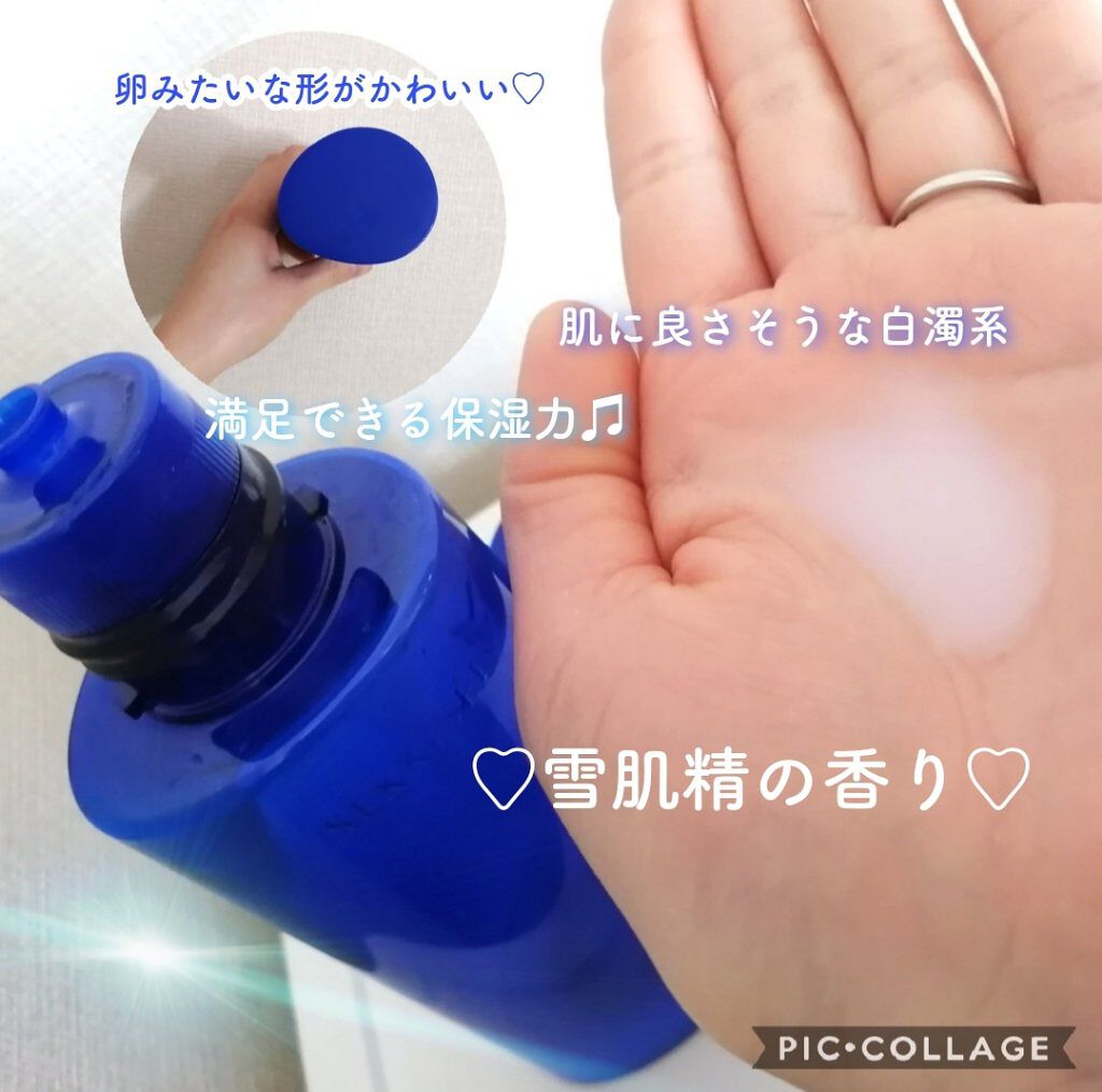 ブルーで雫みたいな形の蓋が特徴的な化粧水です。※写真忘れていました💦すみません。元々雪肌精は気になっていて、その中でも手が出しやすい価格だったので購入しました。白濁色で少しとろっとしたテクスチャーです。前はオルビスユードットの化粧水を使ってい...
