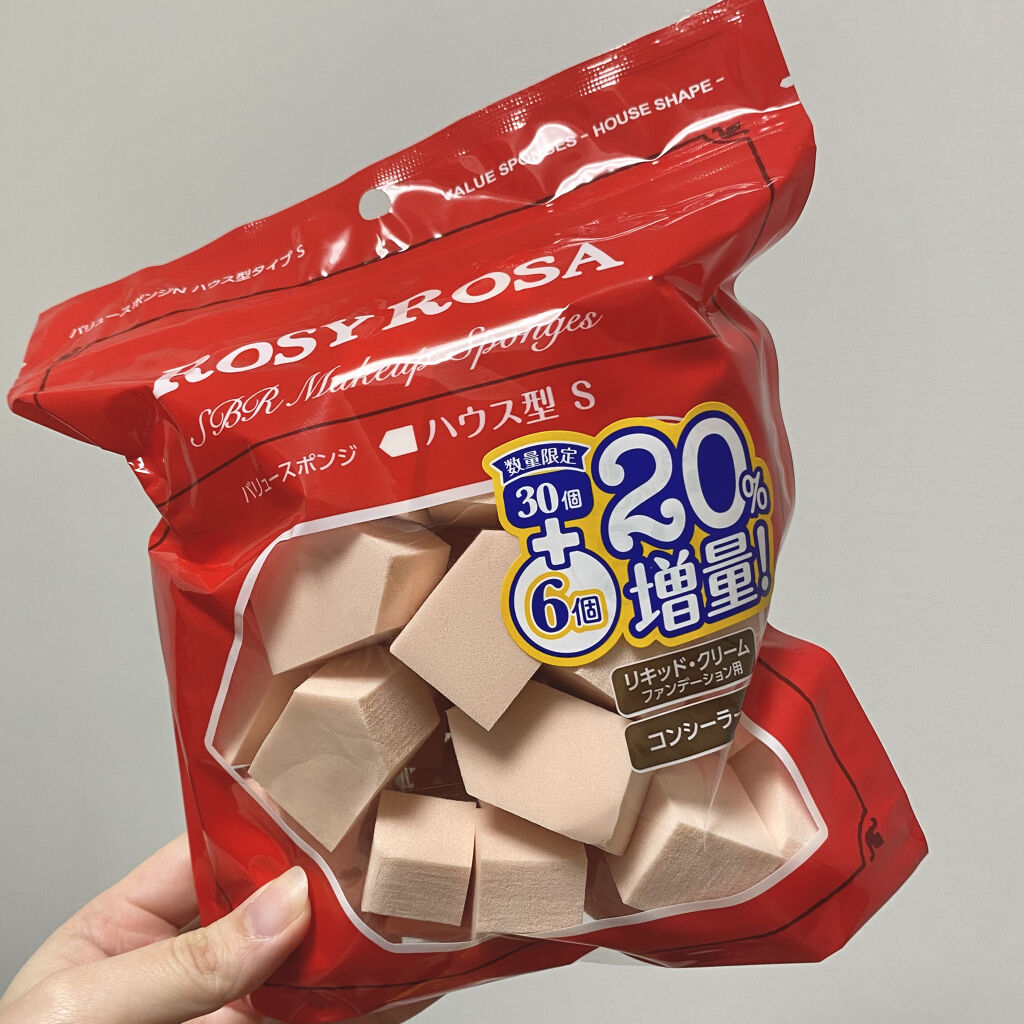ロージーローザのバリュースポンジN ハウス型タイプS 30Pは、角がたくさんあるので、細かいところから広いところまで、綺麗にメイクできますよ。 さわり心地が気持ちよくて、ふわふわなので、肌にも優しい感じがします! 洗うのめんどいし、毎回綺麗なスポンジでメイクするのがいいので、使い捨てを選んでいます。