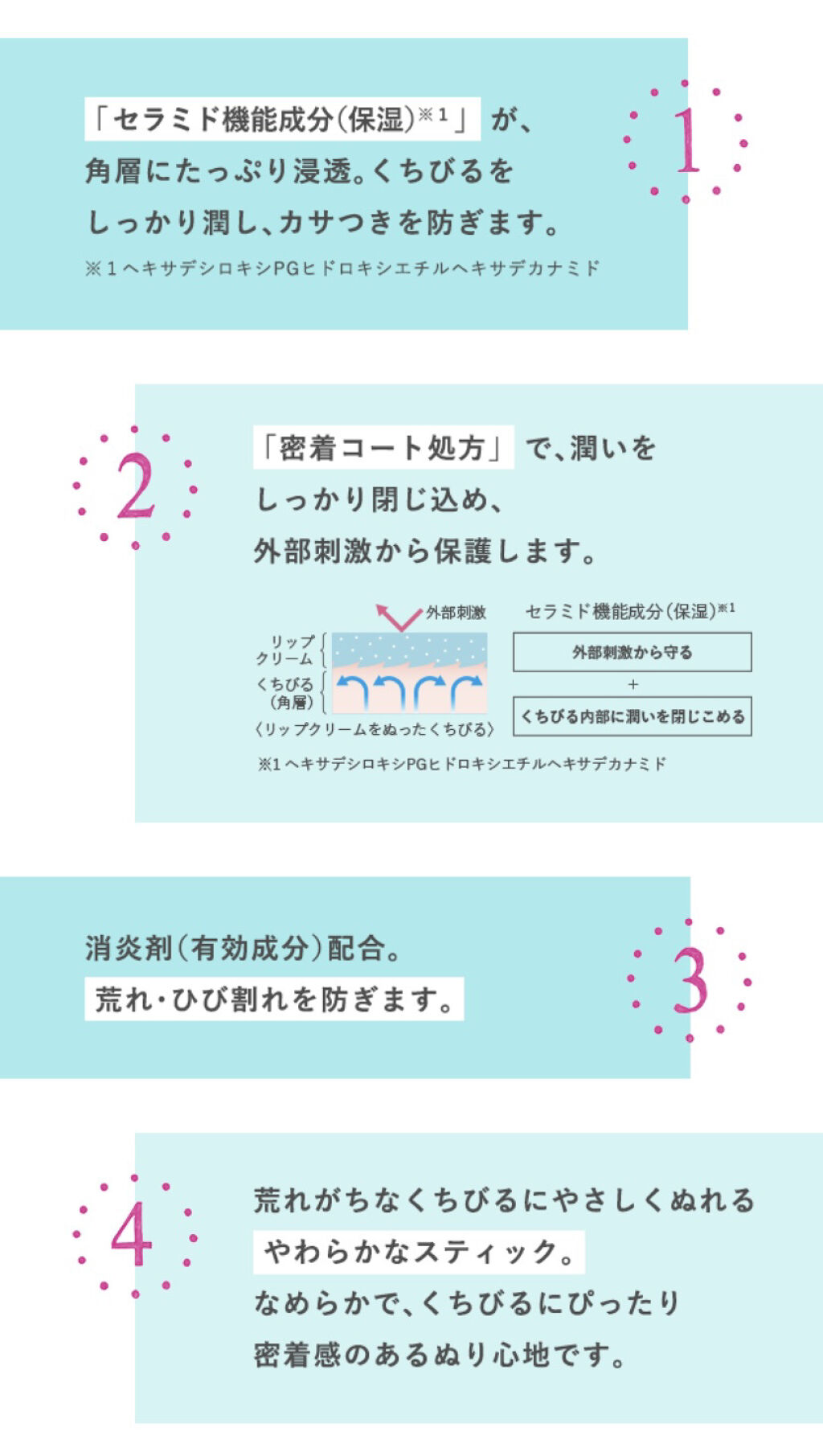 - 【敏感肌用】 ●密着コート処方で、唇内部*1の潤いをしっかり閉じ込めながら、ぴったり密着し続けます。 ●潤い成分(セラミド機能成分*2)が唇の角層に浸透し、乾燥などの外部刺激から保護します。 〇唇の荒れ・ひび割れを防ぎます。消炎剤(有効成分)配合 (医薬部外品) *1角層まで *2ヘキサデシロキシPGヒドロキシエチルヘキサデカナミド 商品に関するお問い合わせ 受付時間9:00~17:00(土曜・日曜・祝日除く) *製品の誤飲・誤食など緊急の場合は、受付時間外でもお電話ください キュレル:0120-165-698