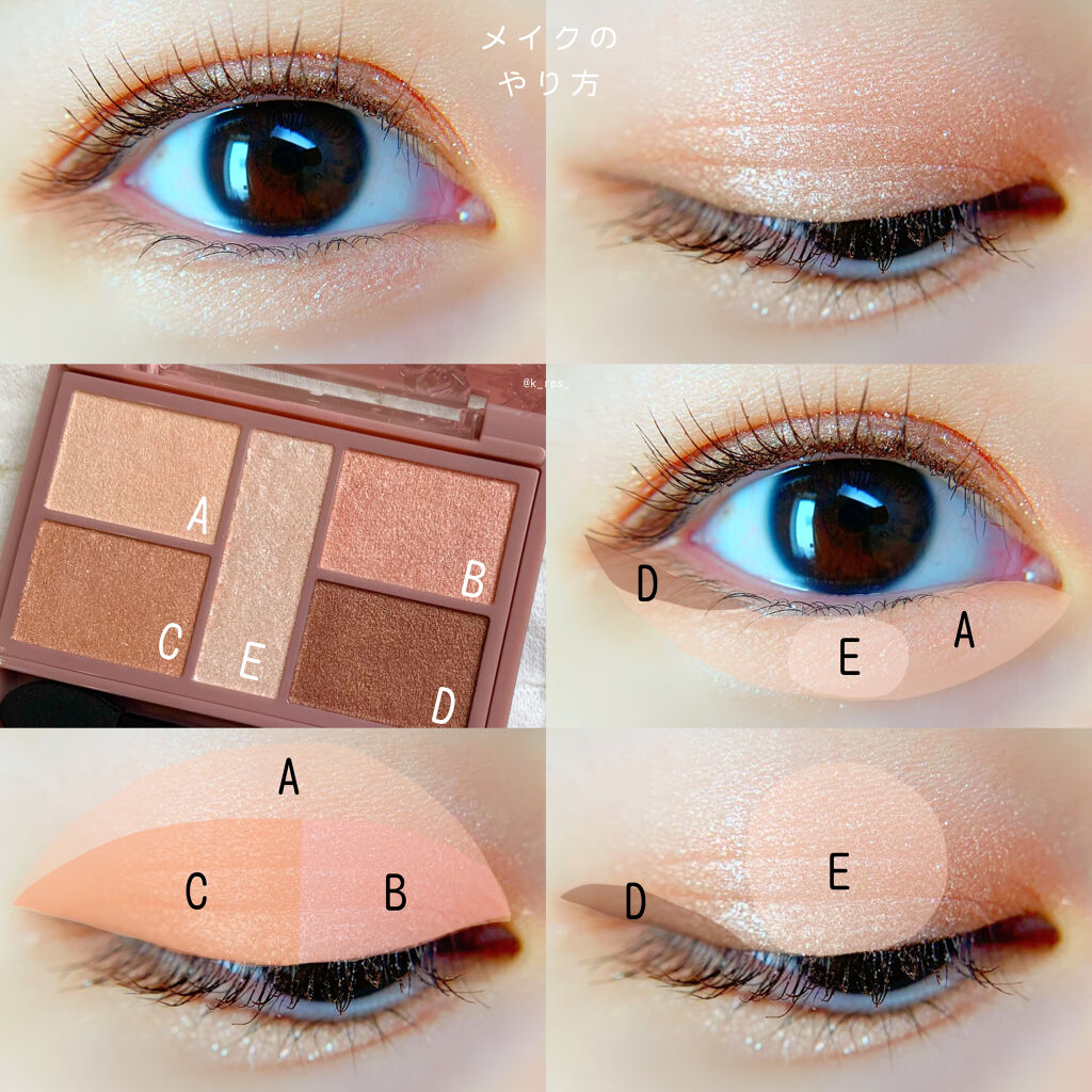 - 1枚のパレットで2つのスタイルが完成! 5色の欲ばりアイシャドウ♥ メインカラーを選んで2つのスタイルが楽しめる! A→B→D でスタイル1 A→C→D でスタイル2 繊細な粉質が、しっとりとまぶたに密着して色落ちを防ぎます。 透明感のあるキラうるトッピングジュエル(繊細ラメ)は、気分によってトッピング!