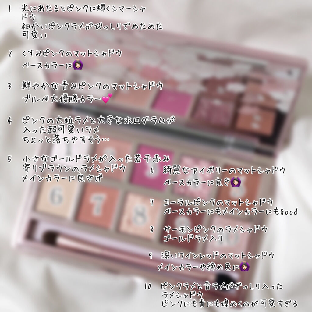 - ロマンチックな桜レリーフ、桜の本物が満開のように粉質が繊細で絹のような、滑らかなメイク効果 ピンクの桜外観。桜の花びらは人目を引き、飾ることも可能です。印象的で。 ロマンチックな桜柄、鮮やかで繊細な咲く桜のように。 10種類の色が揃えており、ピンクアイシャドウパレット。 初心者、学生、オフィスレディーに向いています。