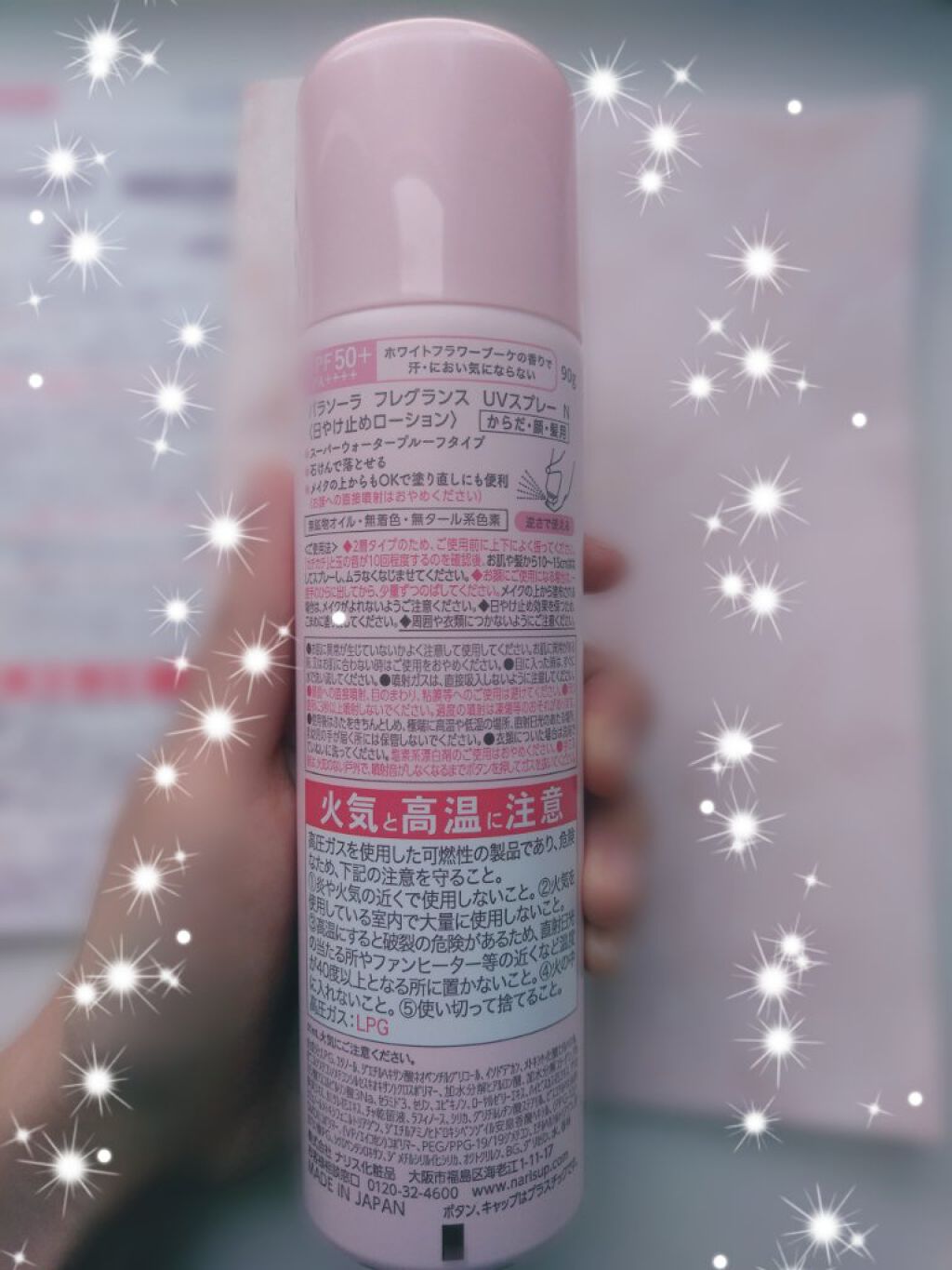 - SPF50+・PA++++ 大人気のフレグランスUVスプレーがリニューアル。 まるで香水みたいな華やかな香り×高密着のスーパーウォータープルーフ 〇ホワイトフラワーブーケの香りで汗・におい気にならない 〇憧れの香水をイメージしたこだわりの香り 〇スーパーウォータープルーフ 〇緑茶エキス・10種の美容液成分*(保湿成分)配合。 〇透明タイプだから髪・メイクの上からでも使え、塗り直しにも便利 (顔への直接噴射はおやめください) 〇逆さで使えて、うなじ・背中・つま先など塗りにくい部分も簡単UVカット。 〇ボディソープで落とせます。 〇汗吸着パウダー**・べたつき抑制成分***配合でべたつきフリーに。 *ナノヒアルロン酸・ナノコラーゲン・高浸透型ビタミンC誘導体・セラミド・アミノ酸・コエンザイムQ10・ローヤルゼリーエキス・ハイビスカス花エキス・ザクロ果実エキス・カミツレエキス配合。 **シリカ ***ラフィノース(整肌成分)