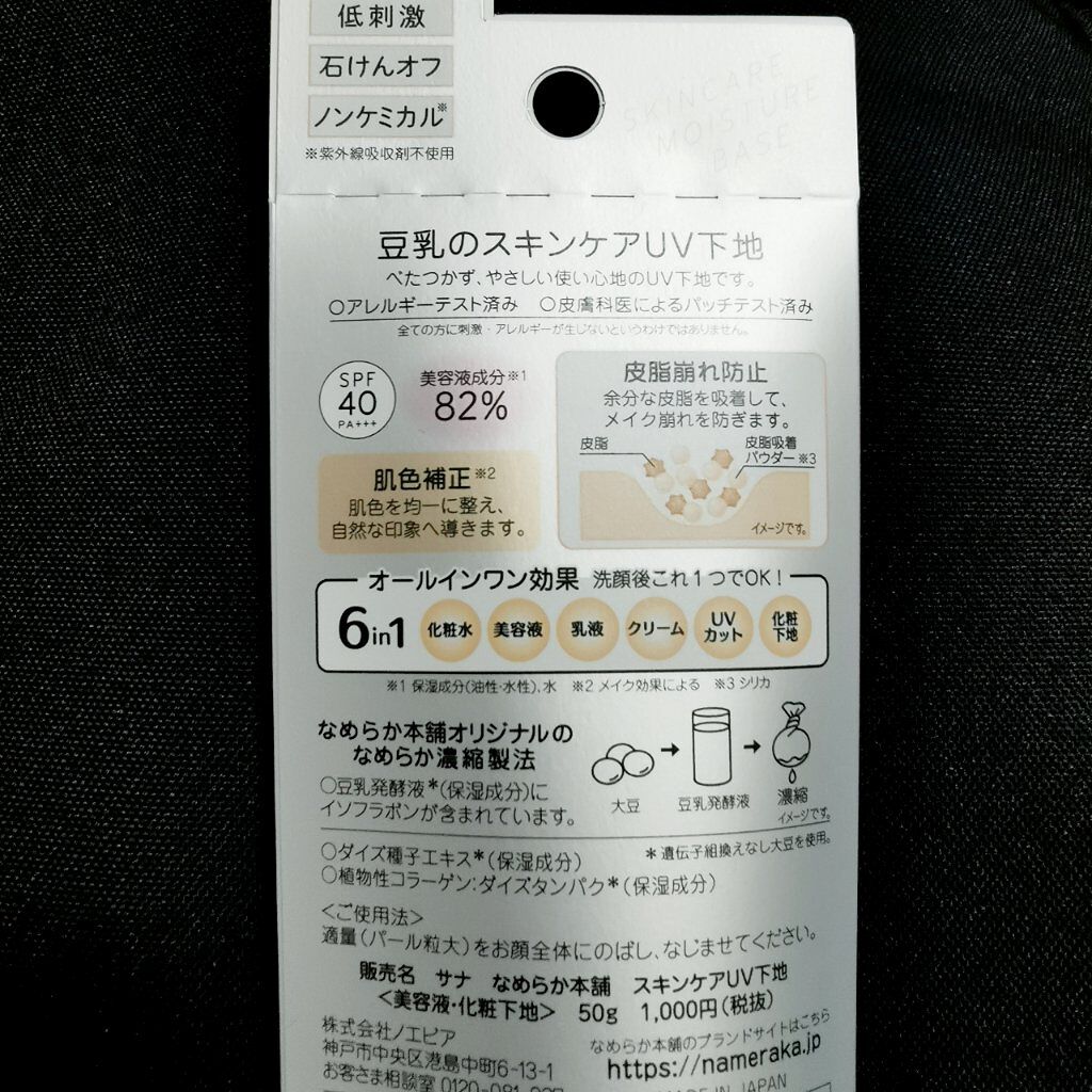 - <スキンケアUV下地> 豆乳のスキンケアUV下地。低刺激&ノンケミカル(紫外線吸収剤不使用)。肌色補正(メイク効果による)&皮脂崩れ防止。化粧水・美容液・乳液・クリーム・UVカット・化粧下地の1本6役。SPF40・PA+++。