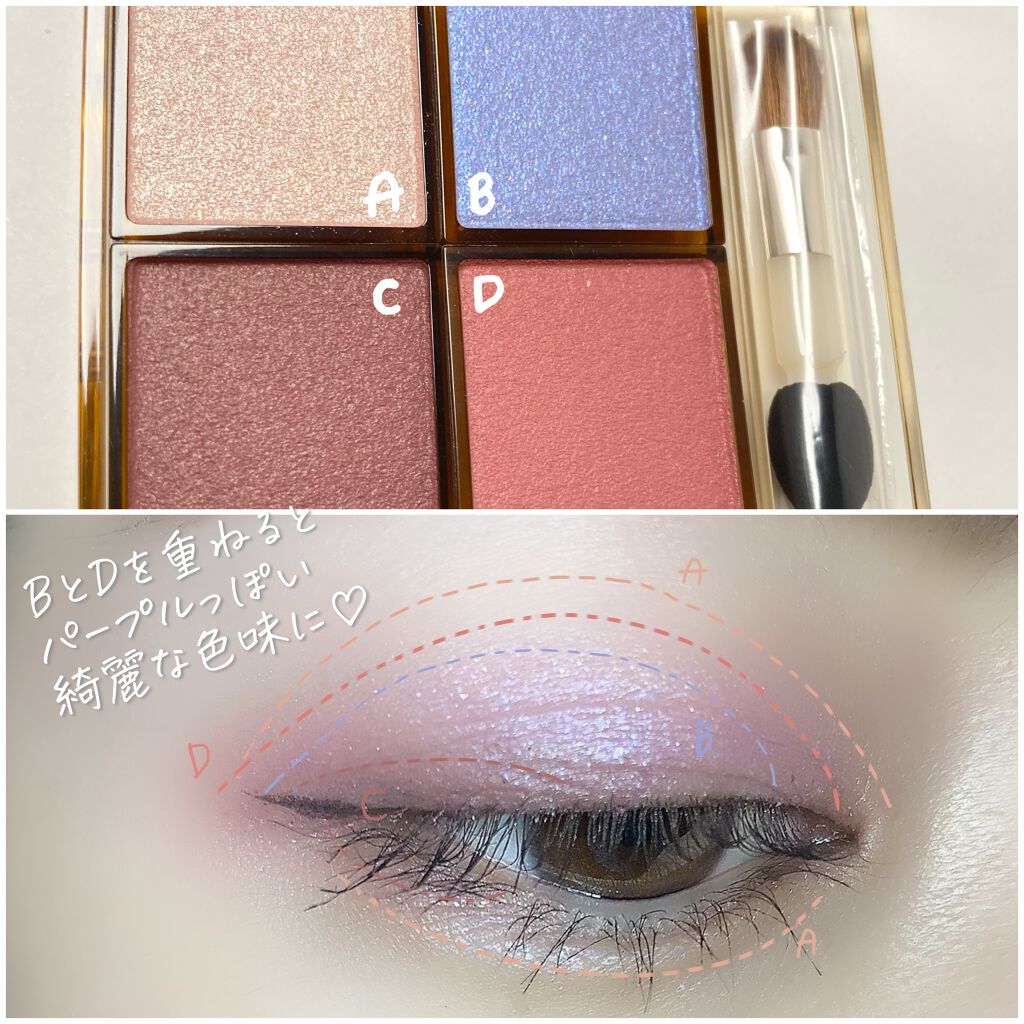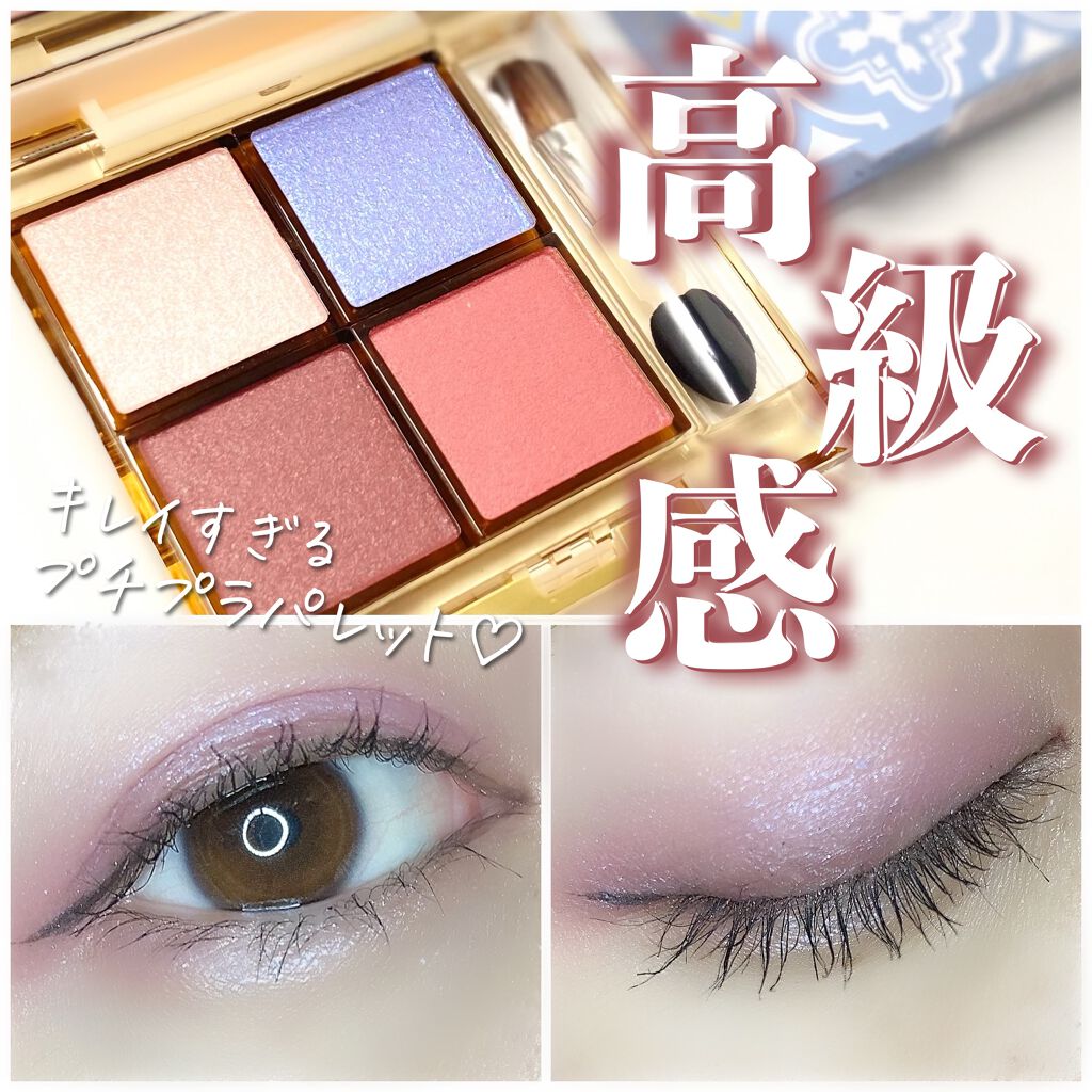 - 色も、質感も、きらめきも。毎日お気に入りの目元を作れる4 色パレットシャドウ 1.様々な色や質感、きらめきを組み合わせて楽しめます。 2.重ねても美しく濁りのないクリアな発色です。 3.まぶたにピタッと密着して粉飛びやヨレを防ぐフィットオイル*1配合。 4.デリケートなまぶたのためのスクワラン*2配合。 <デザイン> ・色調整しやすいオリジナルチップ&ブラシ しっかり発色させたいときにはチップ、ふんわりぼかしたいときにはブラシを。 お好みに合わせてお使いいただけます。 ・ 持ち運びに便利な鏡付き ・ この冬だけの限定デザイン パーティーの華やかさを想起させるカジュアルアートをあしらった開放感あふれるポジティブなデザインです。 *1 リンゴ酸ジイソステアリル *2 保湿成分
