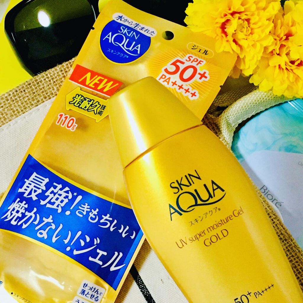 【スキンアクア】スーパーモイスチャージェルポンプタイプ購入しました。UV耐水性が書いてるので新しいバージョンかな?と思います。水のような軽いつけ心地で、ジェルタイプならではのうるおい感。顔にも身体にも使える万能UVで、SPF50+/PA+++...
