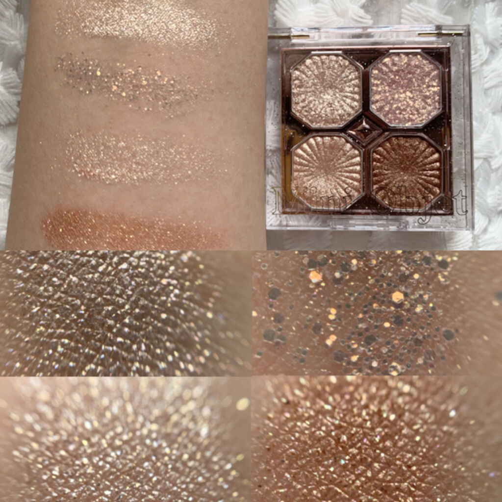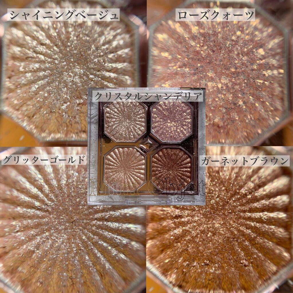 - 4色のアイシャドウを重ねるだけで理想のグラデーションが手軽に完成。深みを与えるマットや上品な艶めきをプラスするシマー、華やかなラメを組み合わせれば、こなれ感とナチュラルさを持ち合わせた目元に。シャンデリアのように華やかなグリッターやラメをのせて、毎日のメイクをもっとスペシャルに!