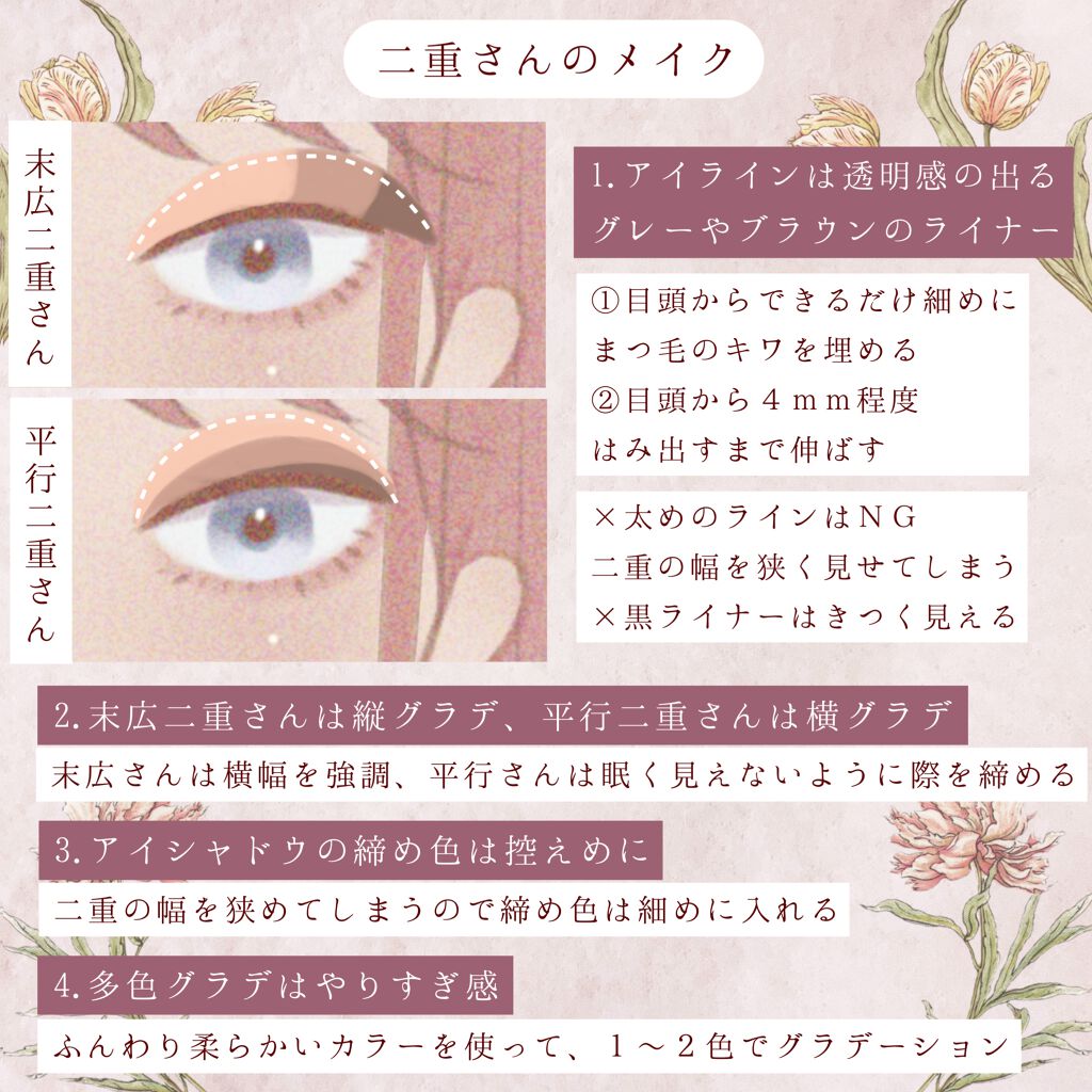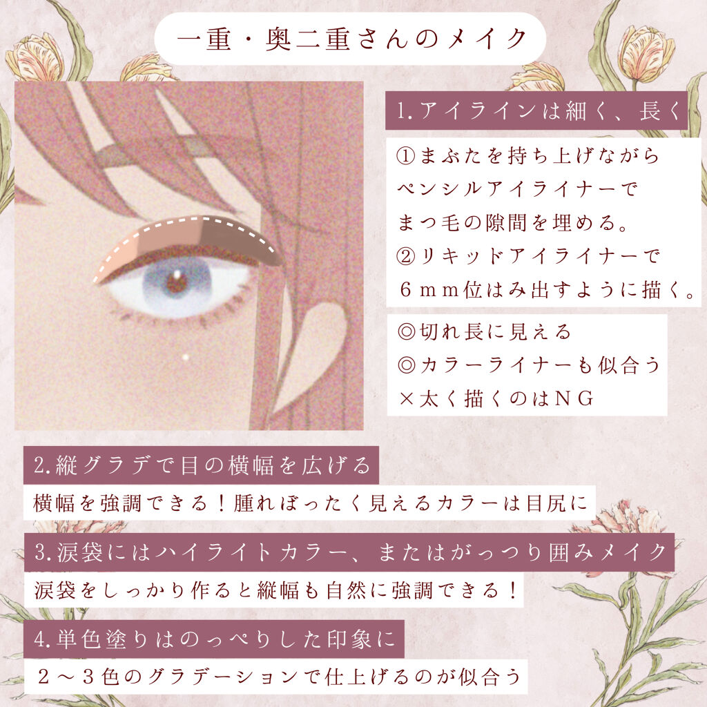 今回は、一重さん、奥二重さん、末広二重さん、平行二重さん別にアイシャドウの塗り方を紹介します🙌🏻 画像で紹介してるアイシャドウはrom&nd ベターザンアイズ ミルクシリーズ W03ドライストロベリーです💁🏼♡ 今っぽアイシャドウの塗り方まとめ👀♡
