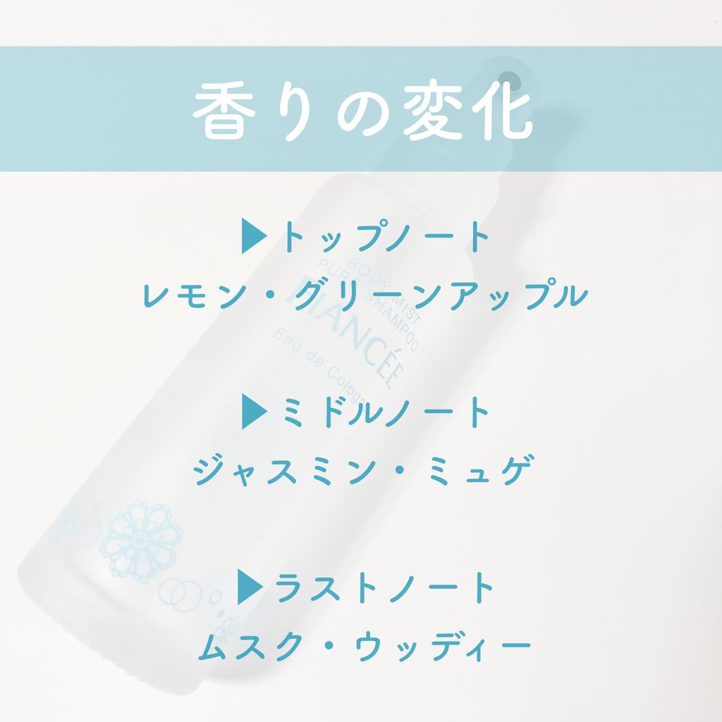 - ※2023年7月31日〜パッケージリニューアル。 甘く爽やかに広がる、お風呂上がりのようなシャンプーしたての香りです。 ふんわりやさしく香るから、フレグランス初心者にもおすすめです。 ●トップノートはグリーンアップルとレモンが爽やかに香ります。 ●ミドルノートはほのかに続くフローラルの香りです。 ●ラストノートが醸し出す上質な清潔感が香りに奥ゆかしさを与えます。