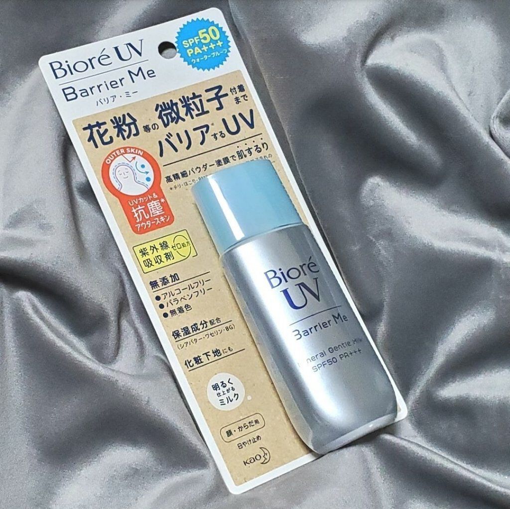 - SPF50/PA+++ 『ビオレUV バリア・ミー ミネラルジェントルミルク』は、花王独自のUVカット&微粒子汚れ付着防止技術を搭載。撥水加工したUV散乱剤のパウダーが肌のキメより細かい超微細な凹凸構造を肌の表面に形成することで、紫外線を防ぐだけでなく、チリやほこり、花粉やPM2.5等の微粒子汚れが肌に付着するのも防ぎます※1。 さらに、紫外線吸収剤ゼロ処方・無添加(アルコールフリー・パラベンフリー・無着色)・保湿成分配合(シアバター・ワセリン・BG)の肌なじみがよい明るく仕上がるミルクタイプなので、マスクの日にも毎日手軽にお使いいただけます。 ※1 チリ・ほこり・PM2.5・花粉等すべての微粒子汚れの付着を防ぐわけではありません。