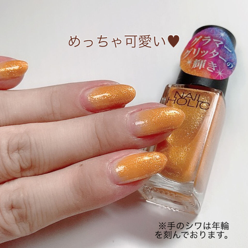 オレンジの誘惑に負けた🧡😍可愛すぎる!!ちふれのオレンジラメ🧡ちふれネイルエナメル017カラフルラメ可愛い、、マジで可愛すぎて夢中で塗ってたら、グラデーションしか出来なかった(笑)オレンジの微細なラメに、大きめゴールドのホロ⭐️塗るとシアーな...