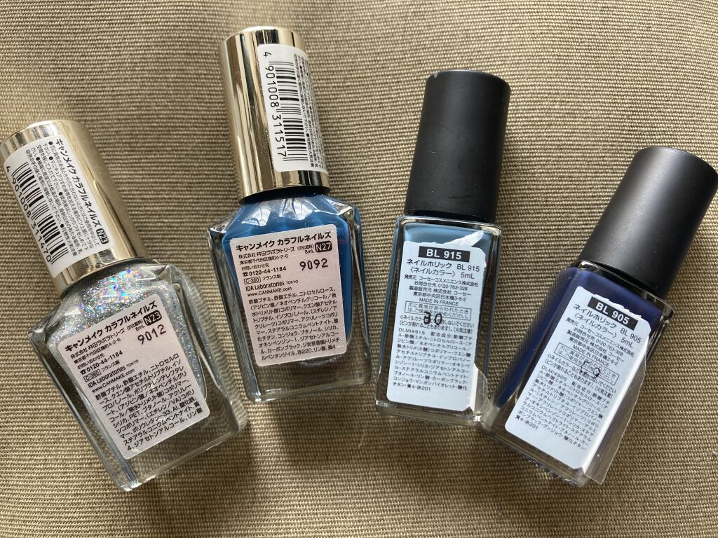excelネイルポリッシュNNL14オーシャンフロントSHISEIDOネイルエナメルピコ08夜の名画座でO・P・IネイルラッカーHRK02ティンカーティンカーウィンカーベースとトップはエテュセです。ベースは少しピンクがかったホワイト。ブルー系...