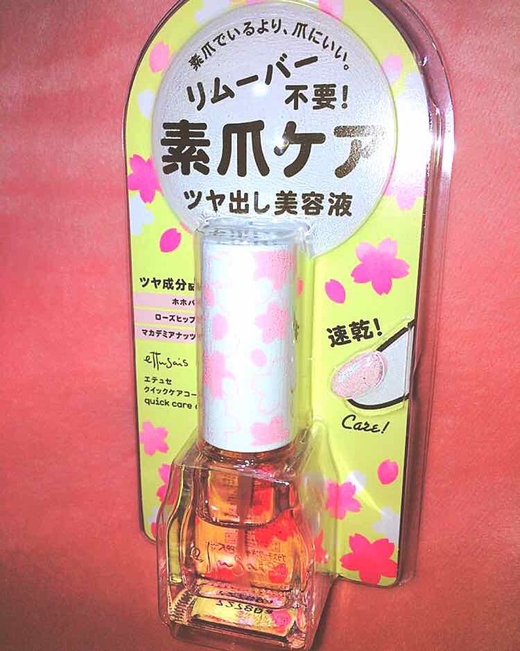 - 素爪でいるより、爪にいい。速乾!リムーバーいらず!透明薄膜ヴェールで爪を保護&ケアする、ツヤ出しネール用美容液。 弱い爪を摩擦や乾燥から保護し、爪のカケ・割れ・二枚爪・乾燥を防ぎます。 塗布すると、エッセンスコート成分が均一な薄膜をつくり、ナチュラル光沢成分&植物オイル(*)が自然なツヤを与えます。 ほんのりピンク色で、爪磨きしたようなナチュラルなツヤ仕上げです。 トルエンフリー、無香料で爪へのやさしさを配慮。 通常のトップコートやハードナーは、一部はがれると、厚みがあるため、凹凸になりますが、「クイックケアコート」は、厚みのない薄膜仕上げなので、落とさず、上から塗布してもキレイになじむので、リムーバーいらずです。 *ホホバ油・ローズヒップ油・マカデミアナッツ油 <こんな時におすすめ> ・爪を保護しながらツヤも出るので、マニキュアをお休みしたい時に ・超速乾だからササッと簡単にケアしたい時に ・ナチュラルなツヤ、仕事上ネールNGでもキレイに見せたい時に 【価格改定について】 いつもご愛用いただきありがとうございます。 この度、原材料高騰などにより、2025年9月1日より、希望小売価格の変更を行うこととなりました。 何卒ご理解を賜わりますよう、心よりお願い申し上げます。 エテュセ クイックケアコート 旧価格 税込1,045円(税抜950円) ↓ 新価格 税込1,265円(税抜1,150円)