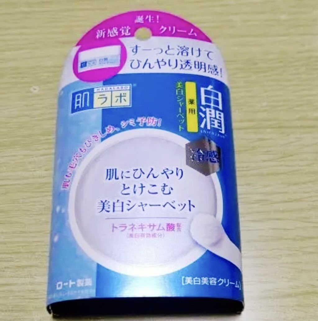 肌ラボ白潤冷感美白シャーベットこちらの商品は、昨年の夏にも購入しました😊手のひらサイズで、付属の小さなスパチュラで、削り取るようにして使います❣️冷蔵庫に冷やしおくと、ほんとシャーベットみたいな削り心地と冷たさが味わえます❄️私は、お風呂上が...