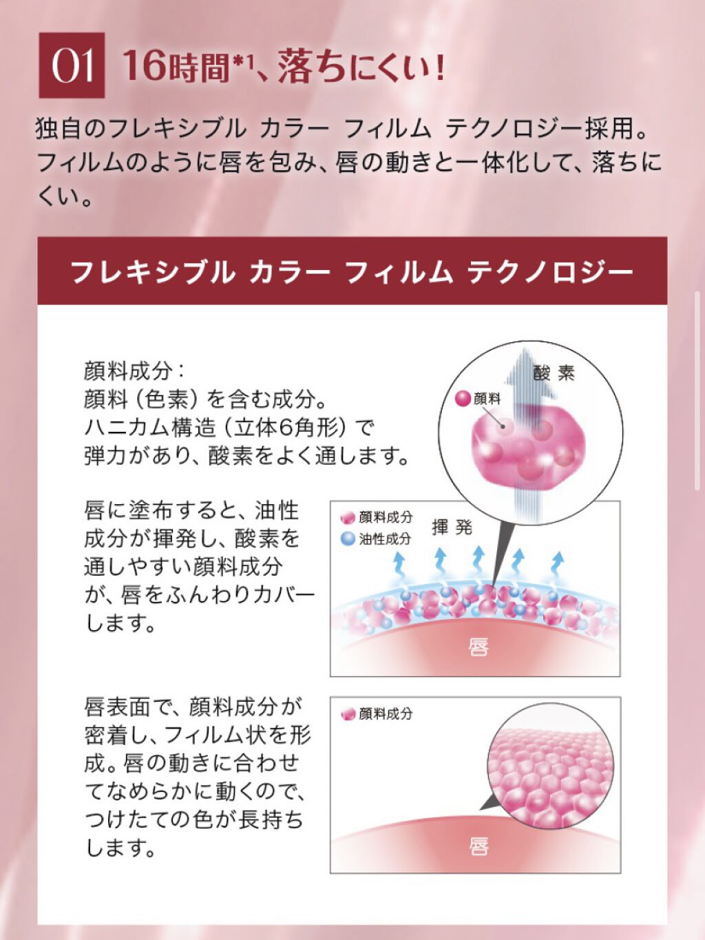- ・ 16時間*1、落ちにくい! 独自のフレキシブル カラー フィルム テクノロジー採用。 フィルムのように唇を包み、唇の動きと一体化して、落ちにくい。 ・ 色移りしにくい、自然なほのツヤ! 唇にとけ込むようになじみ、なめらかにフィット。 マットとツヤの間の絶妙な、ほんのりツヤ感。 ・ うるおい続き、パサつかない! 保湿成分 ブラック カラント シード オイル*2 & ビタミンE誘導体*3配合。 ピタッと密着するのに、快適なつけ心地。 ・ ほんのりフルーティフローラルの香り *1 レブロン研究所調べ(個人差がでる場合があります)*2 クロフサスグリ種子油 *3 酢酸トコフェロール