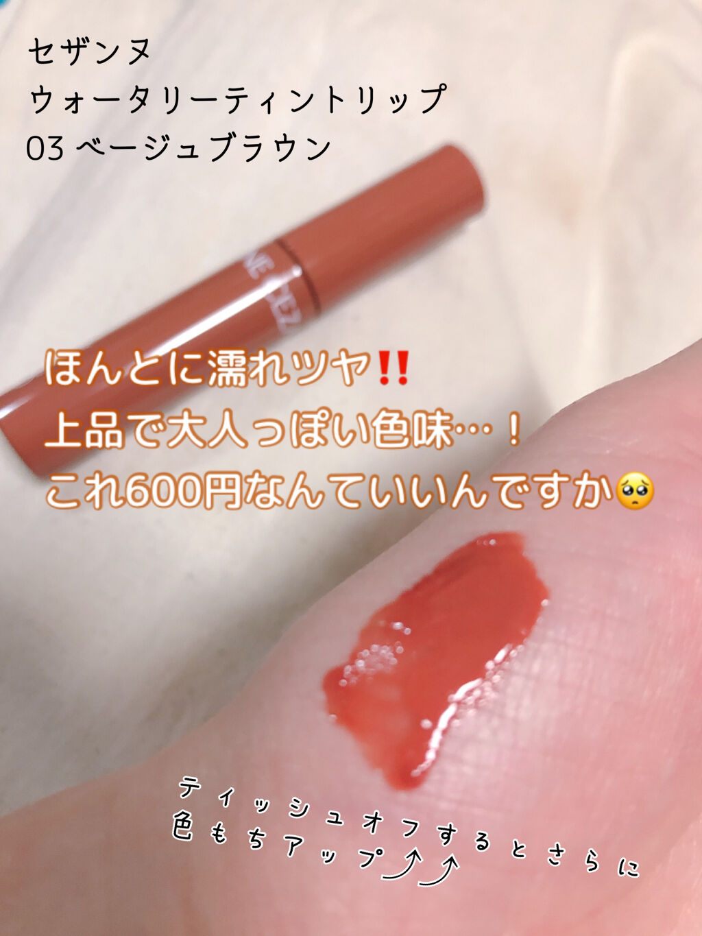 - ツヤ×色×潤いをキープする、セザンヌの新濡れツヤリップ みずみずしい濡れツヤ感ある仕上がりで、発色とツヤが長続きするティントリップです。ティントの発色を透明のベールで覆うリップコートのような処方で、ツヤ感と色をキープします。さらに、唇表面のべたつきは少なく、しっとり潤うオイルinウォーター処方を採用しています。