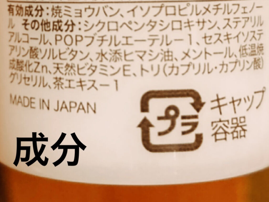 - <20g > 有効成分:焼ミョウバン、イソプロピルメチルフェノール その他成分:シクロペンタシロキサン、ステアリルアルコール、POPブチルエーテルー1、セスキイソステアリン酸ソルビタン、水添ヒマシ油、メントール、低温焼成酸化Zn、天然ビタミンE、トリ(カプリル・カプリン酸)グリセリル、茶エキスー1