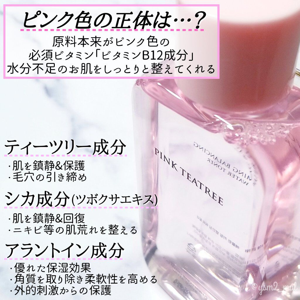 ティーツリーやツボクサ成分(CICA)が配合されているトナー.′.′ ピンク色でふんわりお花みたいなかわいらしい香りです🌷˒˒* このピンク色は自然成分[ビタミンB12]の本来の色で、ビタミンB12は荒れた肌に水分と活力を与え肌環境を整えてくれるんだって✨✨ セラミドNPやアラントインなどの成分が入っていて、保湿と肌荒れ予防を同時にケアしたい人に◎