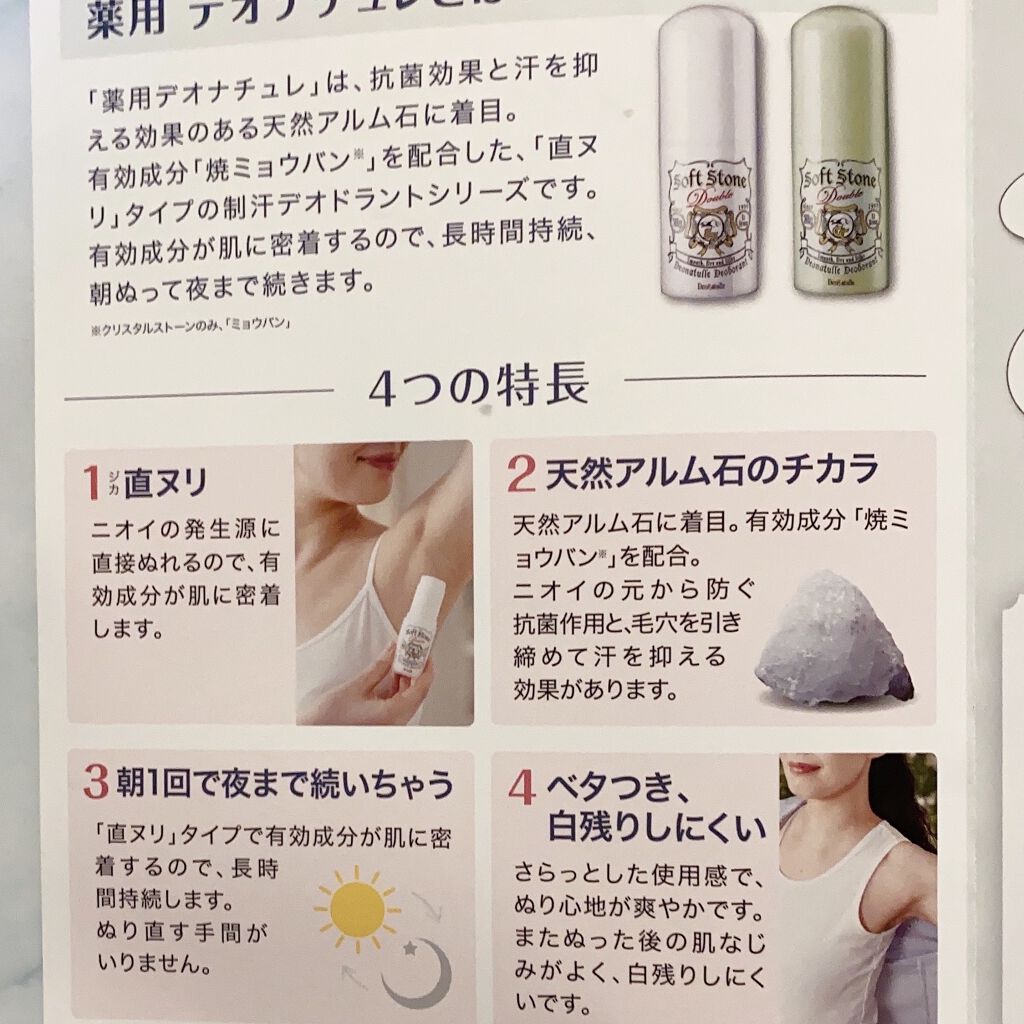 - \11年間ず~っと売上No.1*制汗デオドラント/ ワキの汗・ニオイを元から防ぐ 直ヌリスティック・無香料・アルコールフリー 天然アルム石に着目。有効成分「焼ミョウバン」を配合。 ◆◆ユーザーから選ばれる理由◆◆ ◆『天然アルム石のチカラ』に着目して、汗・ニオイを元から防ぐ! 「デオナチュレ ソフトストーンW」は、天然アルム石に着目。有効成分「焼ミョウバン」を配合し、汗・ニオイを元から防ぎます。 ◆ニオイの発生源・ワキに“直ヌリ”でしっかり密着し、朝ぬって夜まで続いちゃう! 忙しい朝でもサッとつけることができるスティックタイプで、夜まで長時間持続。 ◆すぐにサラサラ!ベタつき・白残りしにくい すぐに洋服を着ることができるので、時間のない朝にも嬉しい! ==注意== ●顔・粘膜を避け、除脱毛直後や肌に異常があるときは使用しないでください。●肌に異常が生じていないかよく注意してご使用ください。また、お肌に合わないとき、使用中に赤み、はれ、かゆみ、刺激、色抜け(白班等)や黒ずみ等の異常があらわれたときは、使用を中止し、皮フ科専門医などにご相談ください。●使用後はキャップをしっかり閉め、直射日光や高温多湿を避けて保管してください。●乳幼児の手の届かないところに置いてください。●スティックを出し過ぎて折れないようご注意ください。●衣類などにつかないようご注意ください。●本製品は残り少なくなりますと、構造上容器の底に中身が若干残ります。そのため、実際には容器に表記されております容量以上を充填しております。 販売名:DN薬用スティックFe *インテージSRI+制汗剤市場 2013年5月~2024年4月 ソフトストーンW(販売名:デオナチュレソフトストーンEX(リニューアル前処方)・DN薬用スティックFe)累計販売金額