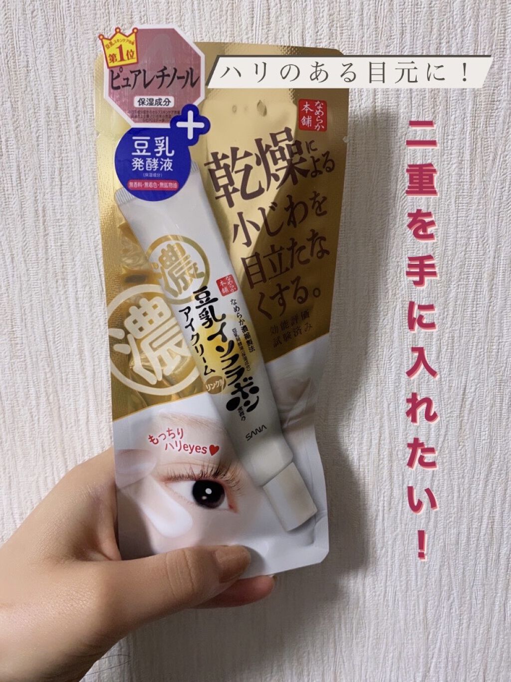 - ピュアレチノール※を新配合!濃厚アイクリームでもっちりハリeyes ※ 保湿成分 「リンクルアイクリーム N」は、『なめらか本舗』オリジナルの豆乳発酵液*1に加え、ピュアレチノール*1とビタミンE誘導体*2を新配合したもっちりとしたハリのある目元に導く「アイクリーム」です。 密着ポリマーがお肌の上で均一な膜を形成し、目元のハリ感をサポート。 毎日のスキンケアに取り入れていただくことで、年齢の出やすい目元をしっかりケアします。 〔①ピュアレチノール*1×豆乳発酵液*1×ビタミンE誘導体*2配合〕 「なめらか本舗」オリジナルのイソフラボン含有の豆乳発酵液*1に加え、ピュアレチノール*1を新配合。 さらに、ビタミンE誘導体(TPNaⓇ)*2も配合し、年齢の出やすい目元をしっかりケアします。 ・ピュアレチノール:ビタミンAの一種でハリのある目元に! ・豆乳発酵液:弾力感・うるおいを与えふっくらした目元に! ・ビタミンE誘導体(TPNaⓇ):お肌にぐんぐん浸透*3してイキイキした目元に! 〔②密着ポリマーで目元にハリ感〕 密着ポリマーがお肌の上で均一な膜を形成します。もっちりとハリのある目元に導きます。 *1 保湿成分 *2 トコフェリルリン酸Na(保湿成分) *3 角層まで