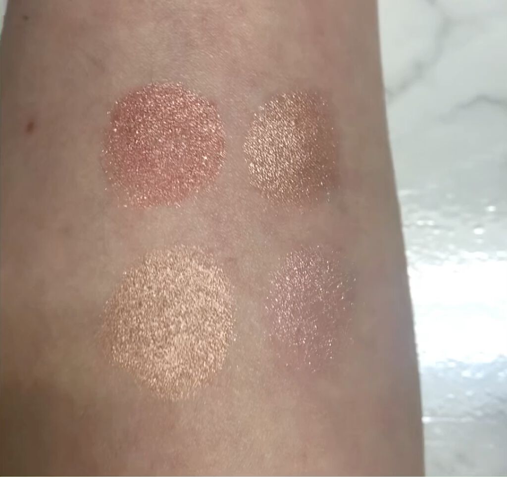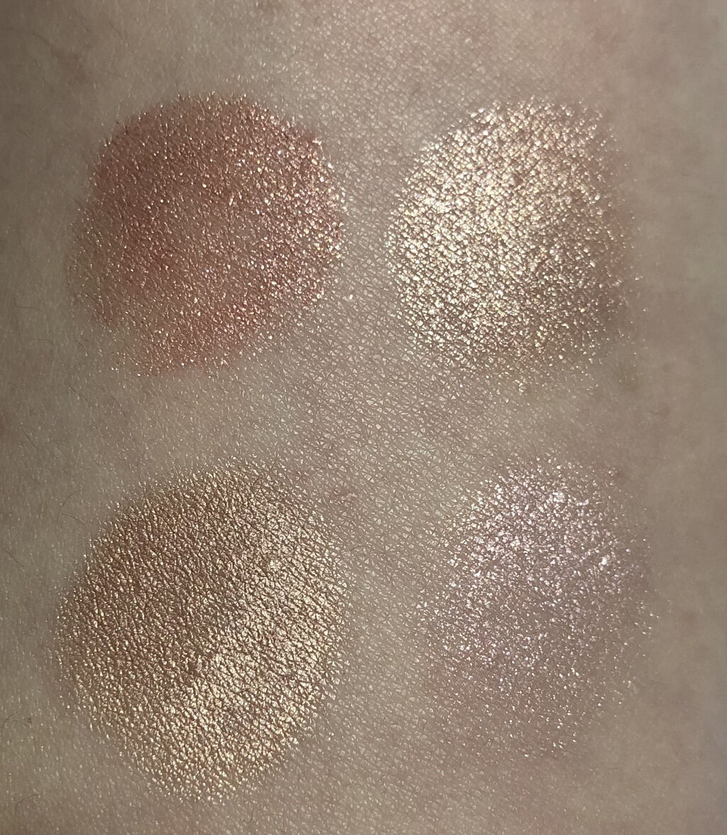 マット3色とグリッター1色がセットになっています。 キャラメルカラーが4色入ったパレットです。 少し赤みが強いブラウン系です。つけると赤みがふわっとさして、ちょっと色気が出る感じになります。 カラーはキャラメル、キャラメルブラウン、ピンク系キャラメルグリッター、ダークキャラメルブラウンです。 グリッターにはピンク、黄色、紫などが入っていて若干偏光ラメになっています。めちゃかわいいです。 くすみベージュ、グレージュ、シャンパンベージュグリッター、スモーキーダークブラウンです。 全体的に超オシャレなグレーカーキ系になります。 グリッターには紫、黄色、少しオレンジなどが入っていて、シャンパンゴールドベースですが偏光ラメで若干青っぽく見えてキレイです。 つけると一気にモードっぽい小洒落た感じになります。量産系メイクには合わないと思いますが、シック系、地雷系、モード系など、ちょっと斜に構えた感じに仕上げたい場合にはめちゃくちゃ馴染みます。