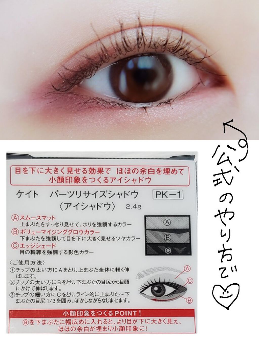 - 研究所のデータに基づいてKATEが提案するのは、「アイシャドウで小顔に見せる」という考え方。アイシャドウで目を下に大きく描くと頬の余白が埋まり、美しい小顔に見える、「小顔リメイクシャドウ」を発売します。 目を下に大きく見せるために計算された、異なる質感の3色で簡単に小顔メイクと目もとが際立つメイクを楽しめます。