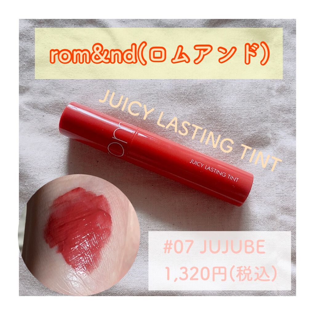 【うるちゅる果汁リップ💎】➸rom&ndジューシーラスティングティント塗った瞬間からツヤっと潤った仕上がりで唇にスっと馴染んで密着してくれます🥀ティントは乾燥しやすい印象がありましたが、ロムアンドは乾燥のストレスなく、唇が荒れることなく使用で...