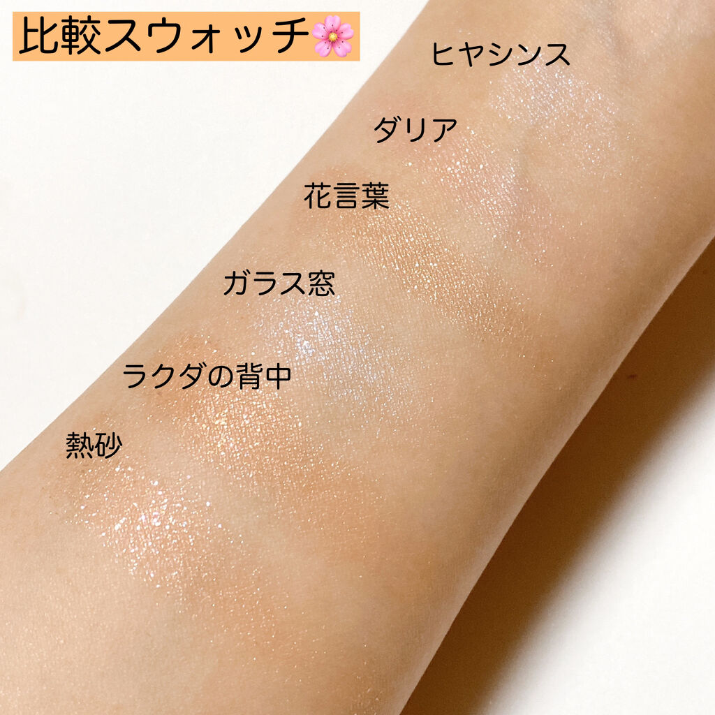 - <BE202 ラクダの背中> ジメチコン、タルク、窒化ホウ素、水添ポリデセン、ポリメチルシルセスキオキサン、ホホバエステル、酸化亜鉛、セスキイソステアリン酸ソルビタン、酸化スズ、エチルヘキシルグリセリン、トコフェロール、ハイドロゲンジメチコン、テトラヒドロテトラメチルシクロテトラシロキサン、テトラデセン、クロルフェネシン、合成金雲母、酸化チタン、マイカ、酸化鉄、グンジョウ、赤226、黄4 <BE223 銀の繭> タルク、ホウケイ酸(Ca/Al)、リンゴ酸ジイソステアリル、ジカプリン酸ネオペンチルグリコール、ミリスチン酸Mg、酸化亜鉛、焼成セリサイト、テトラエチルヘキサン酸ペンタエリスリチル、ヘキサヒドロキシステアリン酸ジペンタエリスリチル、ワセリン、ポリエチレン、シリカ、ダイマージリノール酸ジ(イソステアリル/フィトステリル)、セスキイソステアリン酸ソルビタン、エチルヘキシルグリセリン、水、ハイドロゲンジメチコン、トコフェロール、酸化スズ、ジメチルシリル化シリカ、PEG/PPG-300/55コポリマー、テトラヒドロテトラメチルシクロテトラシロキサン、ヒドロキシプロピルセルロース、テトラデセン、クロルフェネシン、マイカ、酸化チタン、合成金雲母、酸化鉄 <BR324 光る角> タルク、ホウケイ酸(Ca/Al)、リンゴ酸ジイソステアリル、ジカプリン酸ネオペンチルグリコール、ミリスチン酸Mg、酸化亜鉛、焼成セリサイト、テトラエチルヘキサン酸ペンタエリスリチル、ヘキサヒドロキシステアリン酸ジペンタエリスリチル、ワセリン、ポリエチレン、シリカ、ダイマージリノール酸ジ(イソステアリル/フィトステリル)、セスキイソステアリン酸ソルビタン、エチルヘキシルグリセリン、水、ハイドロゲンジメチコン、テトラヒドロテトラメチルシクロテトラシロキサン、トコフェロール、酸化スズ、テトラデセン、ジメチルシリル化シリカ、PEG/PPG-300/55コポリマー、ヒドロキシプロピルセルロース、クロルフェネシン、マイカ、酸化鉄、酸化チタン、合成金雲母 <BR701 花言葉> ジメチコン、窒化ホウ素、リンゴ酸ジイソステアリル、ネオペンタン酸イソデシル、タルク、ホホバエステル、トリエチルヘキサノイン、ワセリン、ミリスチン酸Mg、酸化亜鉛、シリカ、酸化スズ、エチルヘキシルグリセリン、アルミナ、トコフェロール、テトラヒドロテトラメチルシクロテトラシロキサン、テトラデセン、クロルフェネシン、合成金雲母、酸化チタン、マイカ、酸化鉄、グンジョウ、赤226 <OR202 熱砂> ジメチコン、タルク、窒化ホウ素、水添ポリデセン、ポリメチルシルセスキオキサン、ホホバエステル、酸化亜鉛、セスキイソステアリン酸ソルビタン、酸化スズ、エチルヘキシルグリセリン、トコフェロール、テトラヒドロテトラメチルシクロテトラシロキサン、テトラデセン、クロルフェネシン、合成金雲母、酸化チタン、マイカ、酸化鉄、グンジョウ、赤226、黄4 <PK401 ダリア> タルク、ジメチコン、窒化ホウ素、リンゴ酸ジイソステアリル、ネオペンタン酸イソデシル、ホウケイ酸(Ca/Al)、ホホバエステル、トリエチルヘキサノイン、ワセリン、ミリスチン酸Mg、酸化亜鉛、酸化スズ、エチルヘキシルグリセリン、トコフェロール、テトラヒドロテトラメチルシクロテトラシロキサン、テトラデセン、クロルフェネシン、合成金雲母、酸化チタン、マイカ、酸化鉄、グンジョウ、硫酸Ba、赤202、赤226 <VI101 ヒヤシンス> ジメチコン、窒化ホウ素、ホウケイ酸(Ca/Al)、リンゴ酸ジイソステアリル、ネオペンタン酸イソデシル、(ビニルジメチコン/メチコンシルセスキオキサン)クロスポリマー、タルク、ホホバエステル、トリエチルヘキサノイン、ワセリン、酸化亜鉛、ミリスチン酸Mg、酸化スズ、エチルヘキシルグリセリン、トコフェロール、テトラヒドロテトラメチルシクロテトラシロキサン、テトラデセン、クロルフェネシン、合成金雲母、酸化チタン、グンジョウ、酸化鉄、マイカ <BL102 ガラス窓(限定)> ジメチコン、タルク、窒化ホウ素、ホウケイ酸(Ca/Al)、水添ポリデセン、ポリメチルシルセスキオキサン、ホホバエステル、酸化亜鉛、セスキイソステアリン酸ソルビタン、酸化スズ、エチルヘキシルグリセリン、トコフェロール、テトラヒドロテトラメチルシクロテトラシロキサン、テトラデセン、クロルフェネシン、合成金雲母、酸化チタン、マイカ、酸化鉄、グンジョウ、コンジョウ <BL225 冷凍ベリー(限定)> タルク、ホウケイ酸(Ca/Al)、リンゴ酸ジイソステアリル、ジカプリン酸ネオペンチルグリコール、ミリスチン酸Mg、酸化亜鉛、焼成セリサイト、テトラエチルヘキサン酸ペンタエリスリチル、ヘキサヒドロキシステアリン酸ジペンタエリスリチル、ワセリン、ポリエチレン、シリカ、ダイマージリノール酸ジ(イソステアリル/フィトステリル)、セスキイソステアリン酸ソルビタン、エチルヘキシルグリセリン、酸化スズ、水、ハイドロゲンジメチコン、トコフェロール、ジメチコン、ジメチ