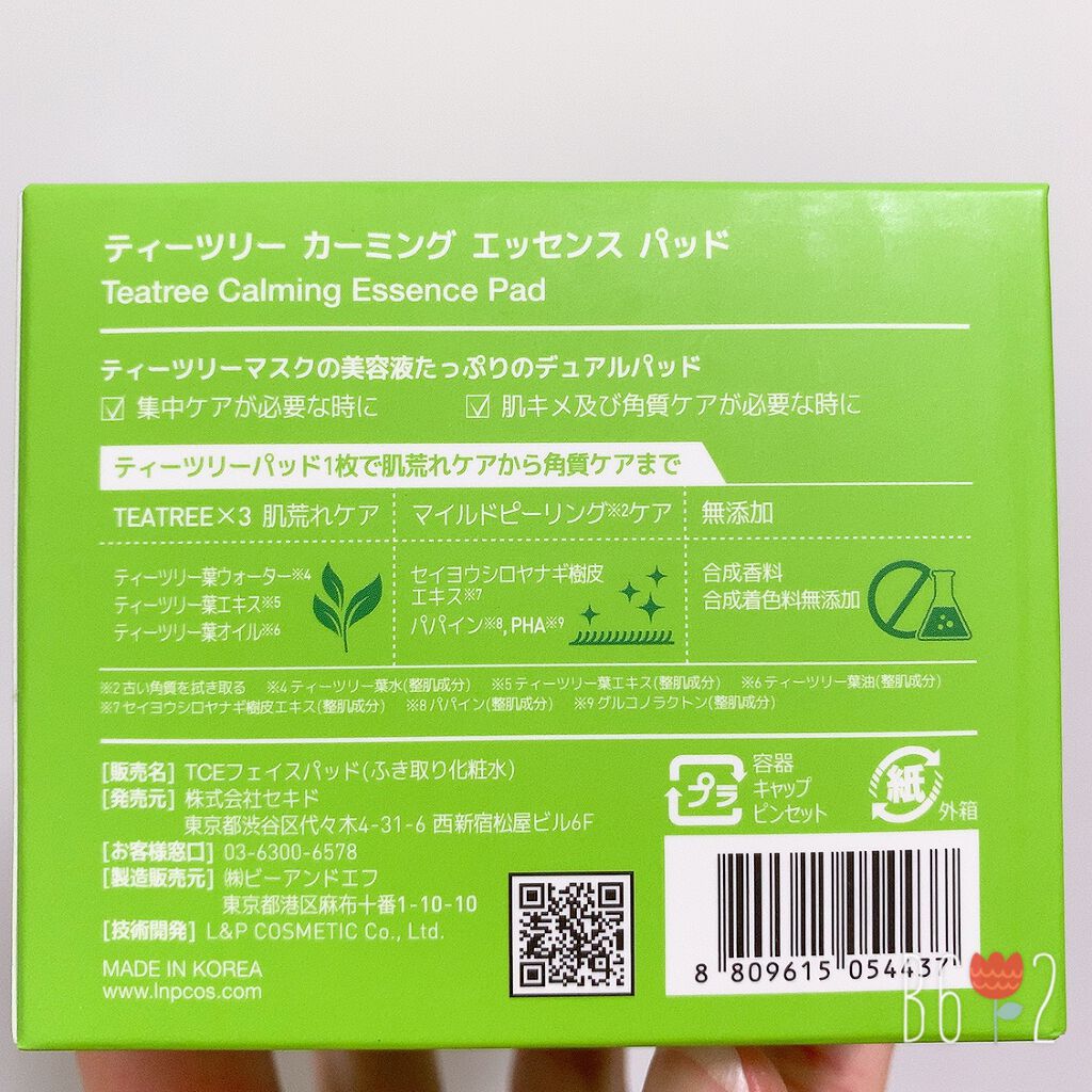- 肌荒れを予防するティーツリーエッセンス(ティーツリー葉水、ティーツリー葉エキス、ティーツリー葉油の3種類を整肌成分として)を、コットン100%の肌に優しい使い心地のパッドに贅沢にたっぷり配合しております。 片面はエンボスコットン、もう片面がソフトコットンになった「デュアルパッド」になっており、用途に応じての使い分けが可能です。エンボスコットンの面は、手軽に角質・毛穴汚れをオフできる拭き取り化粧水としてお使いいただけます。ソフトコットンの面は、乾燥が気になる部分、肌荒れ予防や集中ケアしたい部分のポイントパックとしてお使いいただけます。 ※2022年9月以降パッケージリニューアル。