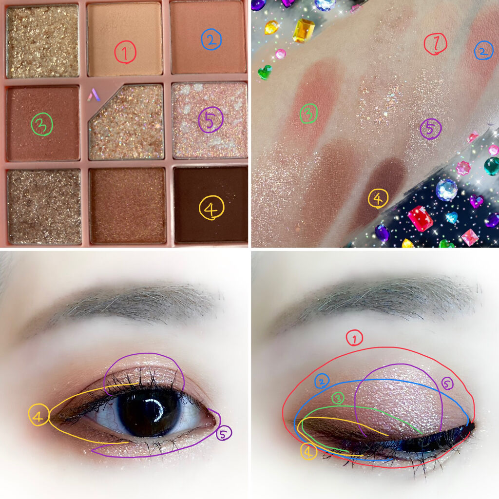 時と場所を選べるアイシャドウパレット🥰ベージュ系のアイシャドウなので、デイリーはもちろん、スッピンメイク、学校、お仕事、デート、パーティー……なんでもかんでも行けちゃう……🥺今回は派手目なアイメイクにしてみました🤗瞼中央のきらめき✨④のシャド...
