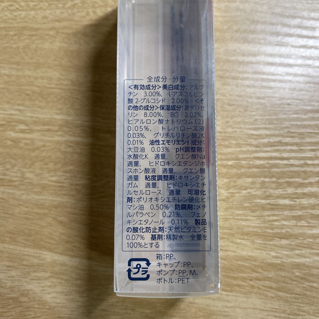 - <有効成分> 美白成分 アルブチン3.00%、〃 L−アスコルビン酸 2−グルコシド0.02、<その他の成分> 、保湿成分 濃グリセリン8.00%、〃 BG2.02%、〃 ヒアルロン酸ナトリウム(2)0.05%、〃 トレハロース液0.03%、〃 グリチルリチン酸2K0.01%、油性エモリエント成分 大豆油0.03%、pH調整剤 水酸化K適量、〃 クエン酸Na適量、〃 ヒドロキシエタンジホスホン酸液適量、〃 クエン酸適量、粘度調整剤 キサンタンガム適量、〃 ヒドロキシエチルセルロース適量、可溶化剤 ポリオキシエチレン硬化ヒマシ油0.50%、防腐剤 メチルパラベン適量、〃 フェノキシエタノール適量、製品の酸化防止剤 天然ビタミンE適量、基剤 精製水全量を100%とする、 、 、 、 、 、 、 、 、 、 、 、 、 、 、